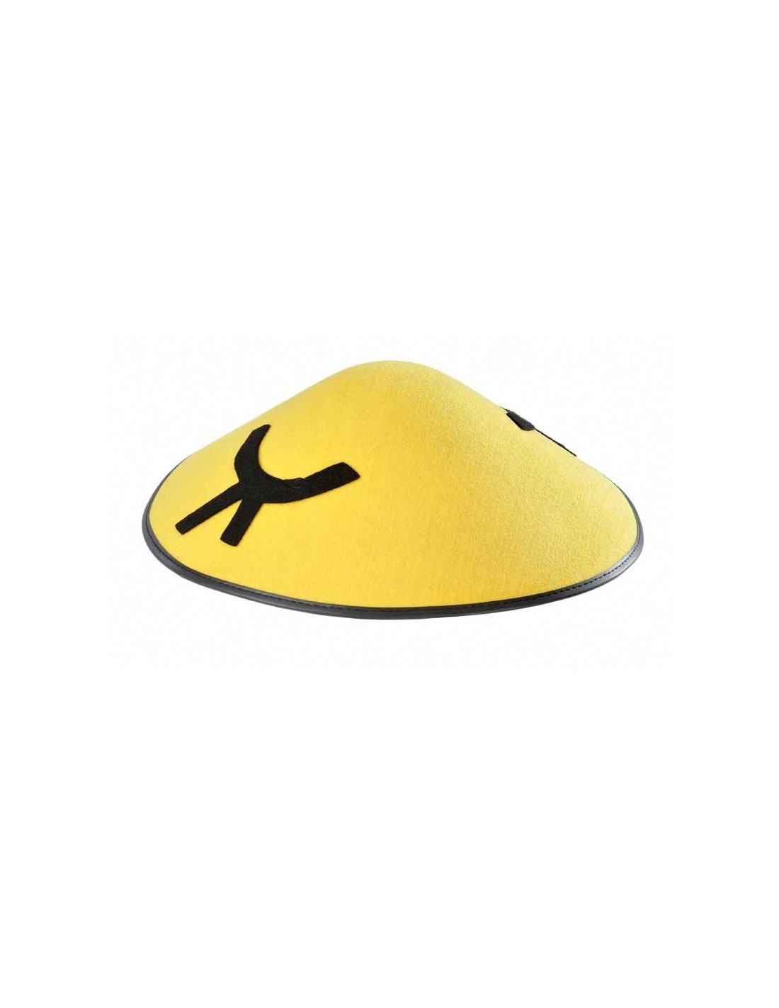 Sombrero de fieltro amarillo viveado y decorado con simbolos chinos de fieltro pegados