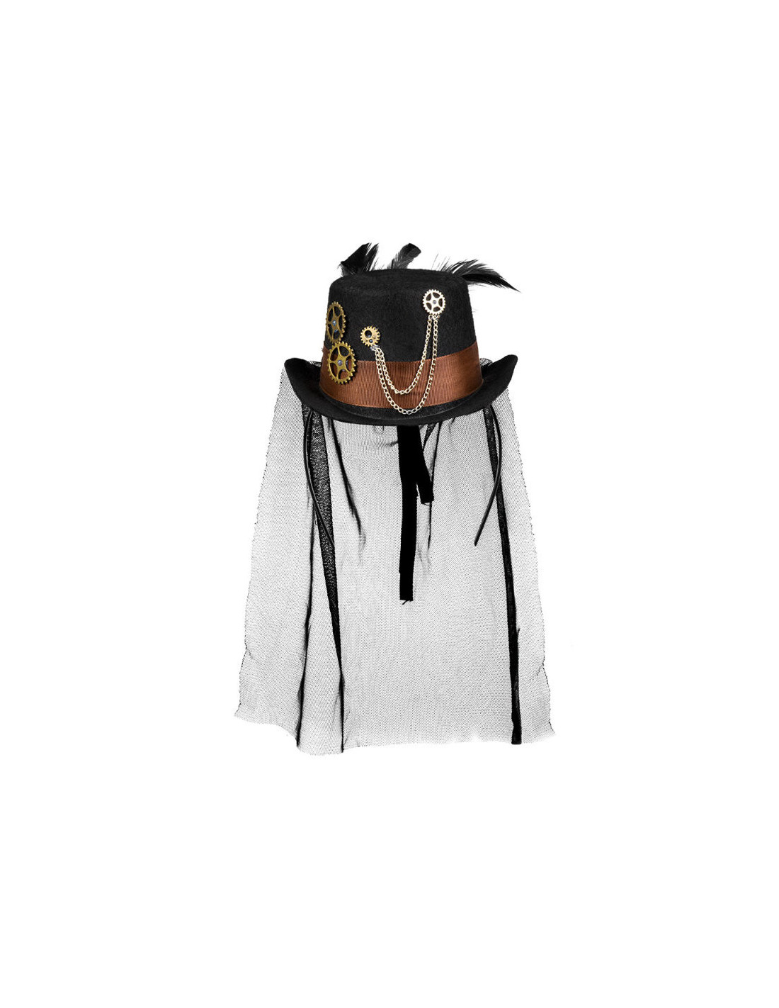 No le falta detalle a esta mini chistera que se compone de una diadema con un mini sombrero decorado con engranajes y cadenas, y tul negro en la parte posterior.