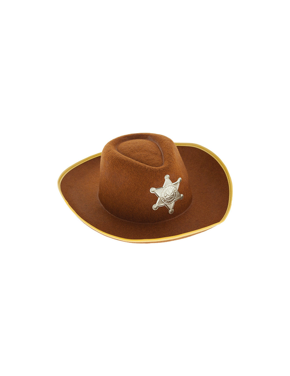 El sombrero de vaquero es de color marrón, rígido y con una estrella de sheriff en la parte frontal.