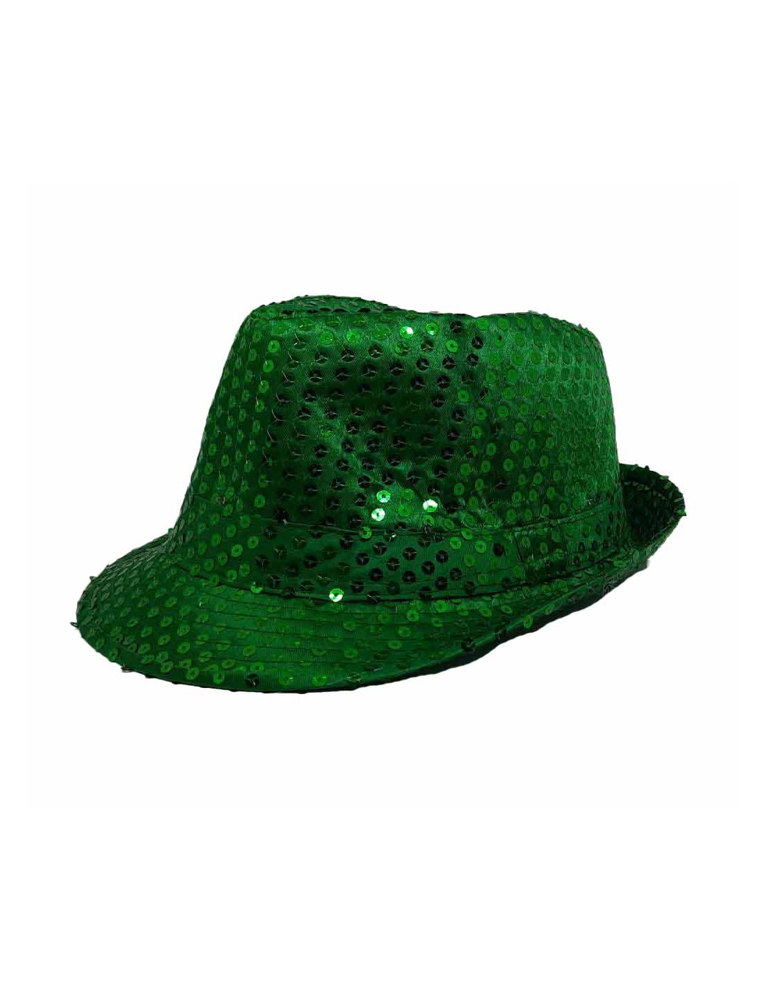 Sombrero gánster lentejuelas con luz de unos 58 cm de contorno con luces de diferentes posiciones. Funciona con tres pilas LR44. Colores surtidos