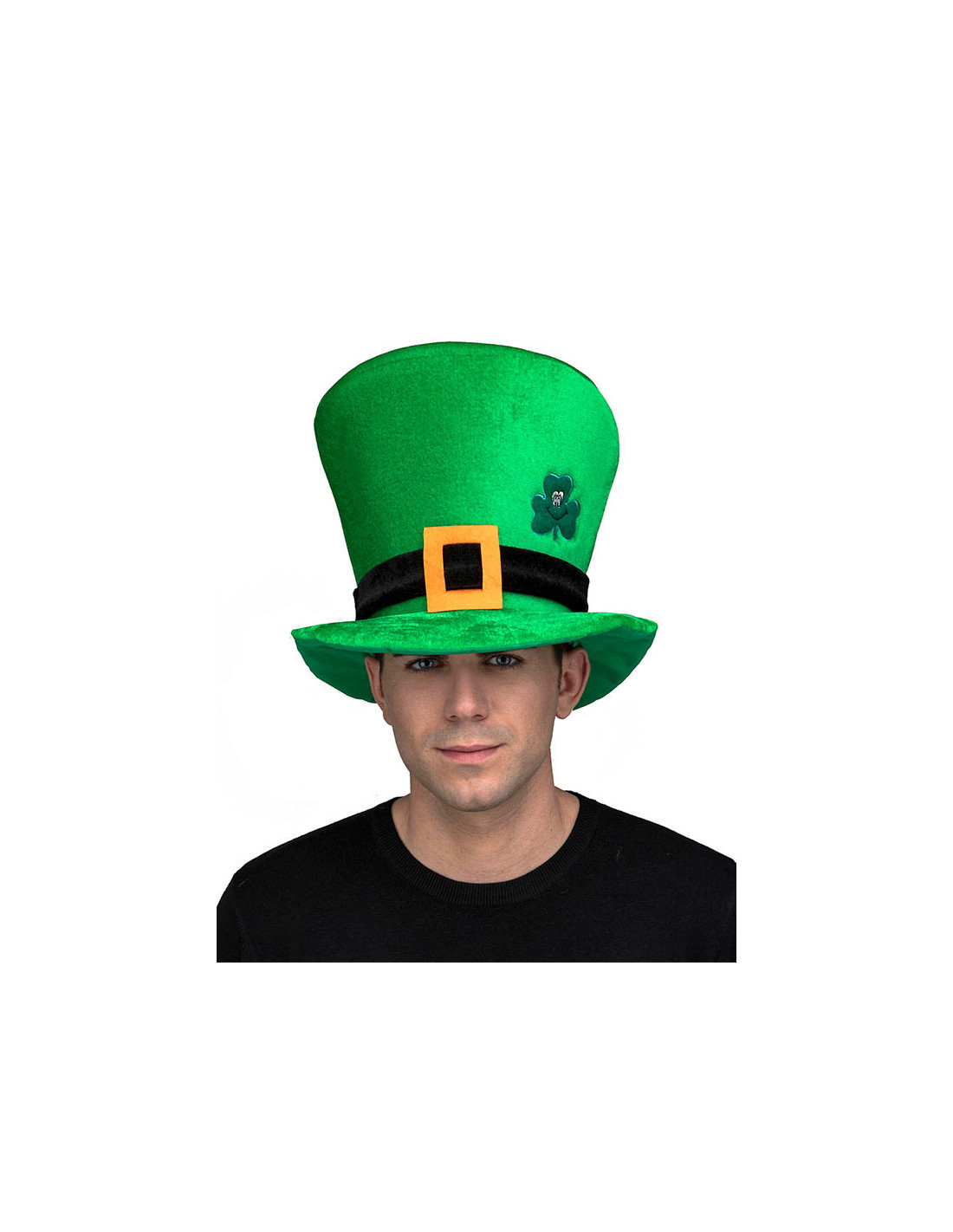 El sombrero irlandés es de tela y simula una chistera de copa alta. Tiene una cinta negra con hebilla dorada, todo ello de tela; y un pequeño trébol decorativo.