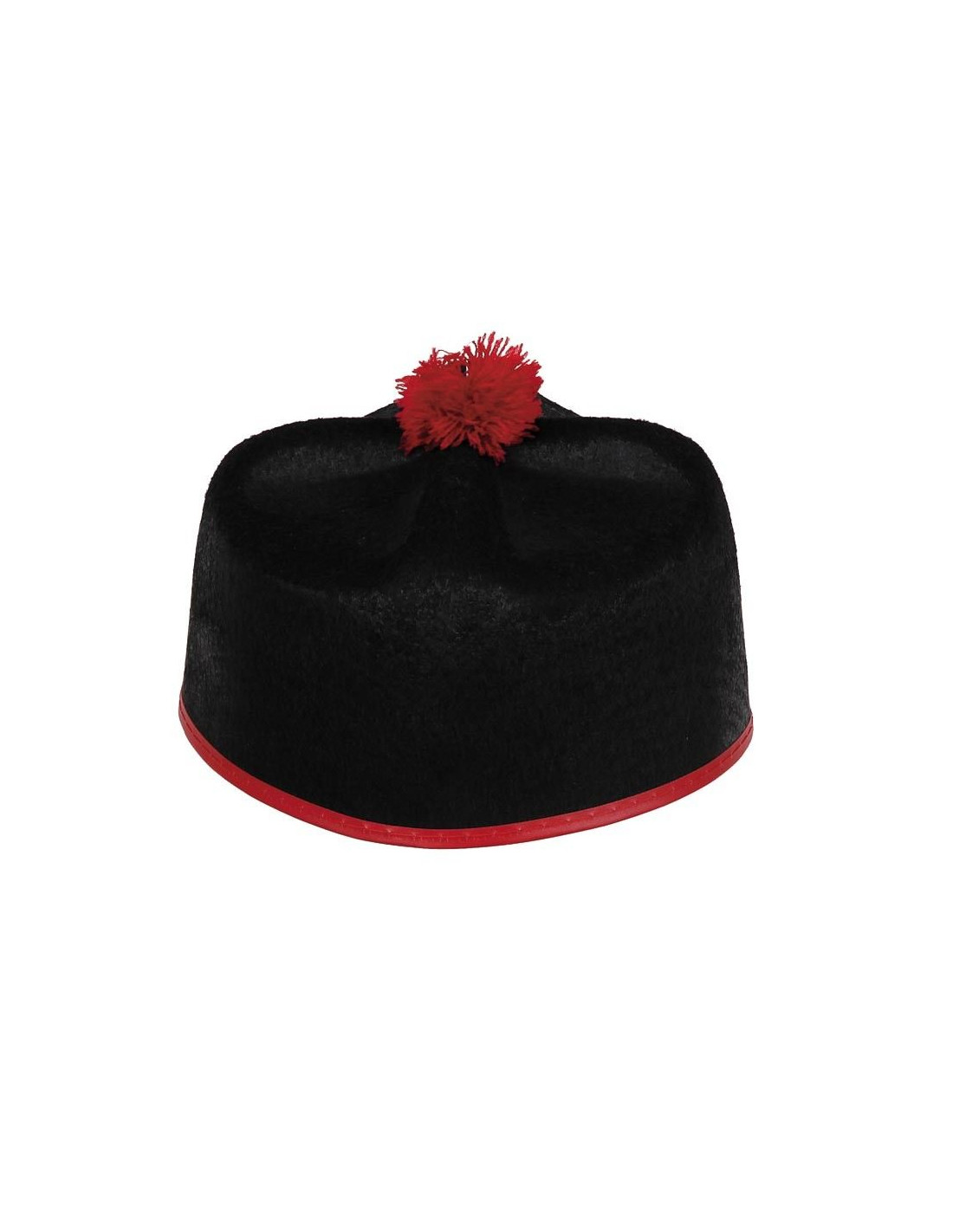 Sombrero de fieltro negro de unos 58cm de perimetro interior, ribeteado en rojo con pompon del mismo color, para complementar al traje de monaguillo junto a una campana.