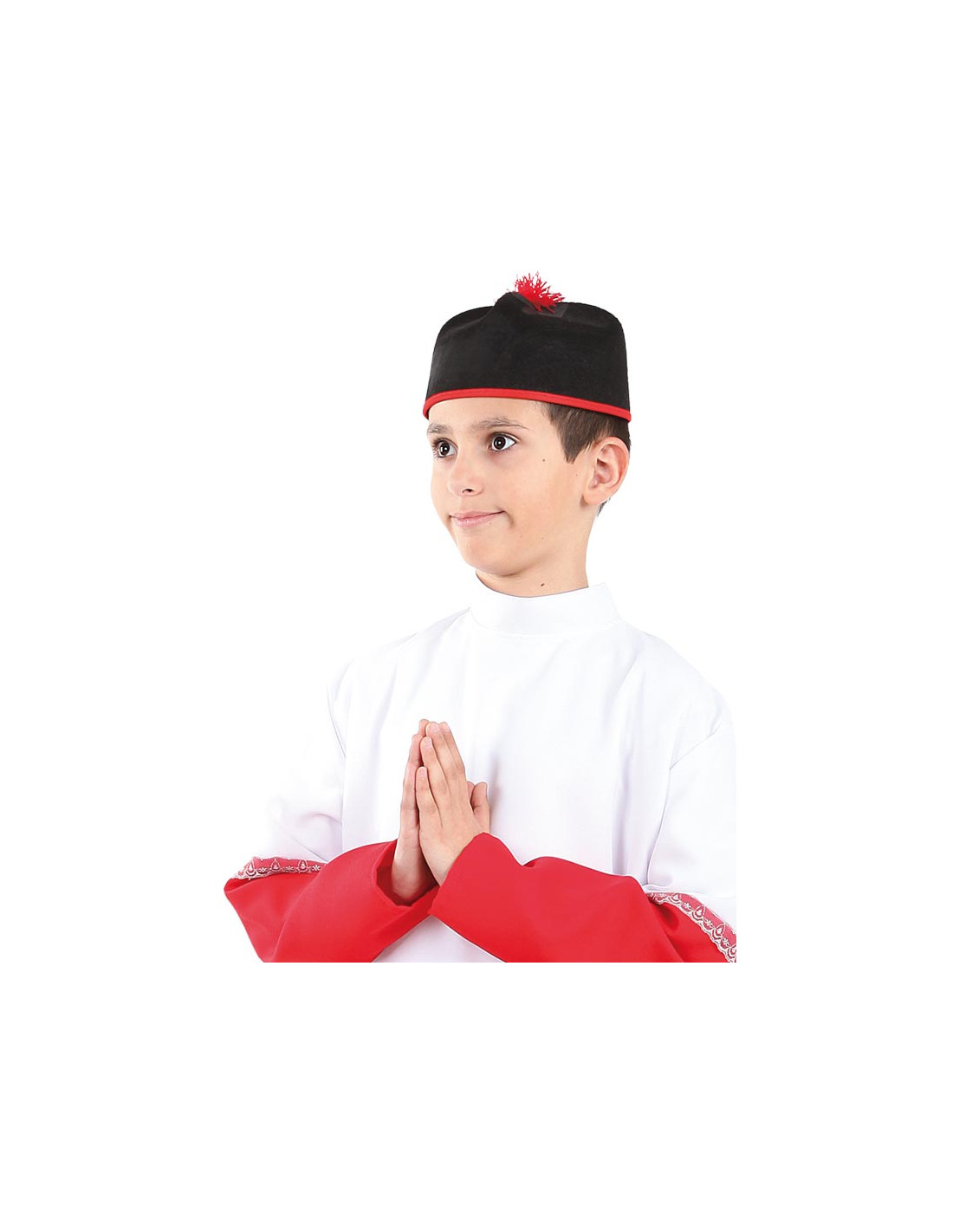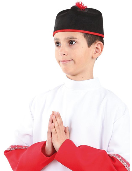 Complementa tu disfraz religioso con este sombrero de monaguillo. Fabricado en fieltro. Incluye sombrero de monaguillo, ribeteado en color rojo, pompón del mismo color. Dimensiones de 58cm de perímetro.