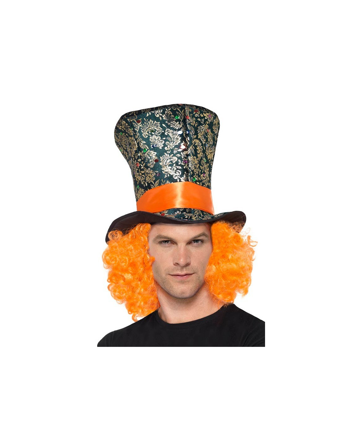 Sombrero Sombrerero Loco que consta de un sombrero de copa multicolor, con pelo naranja.