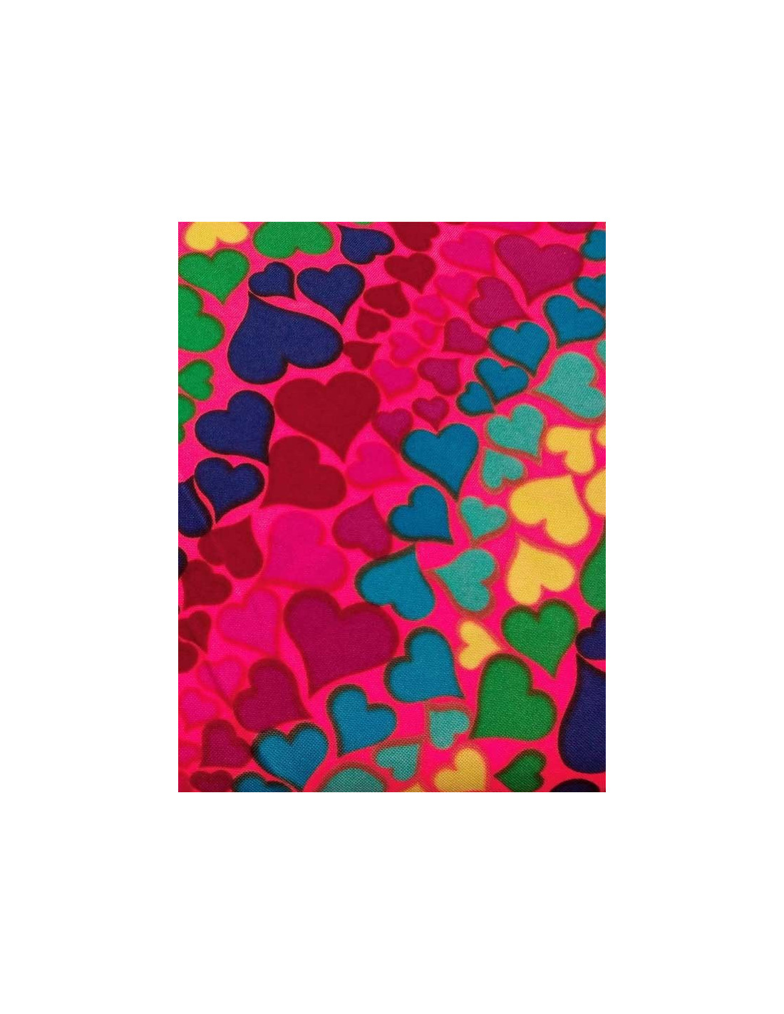Tejido de strech, 100% poliéster de 150cm de ancho con estampado de corazones de varios tamaños y colores. Se vende por metros. Unidad minima de compra 1m.