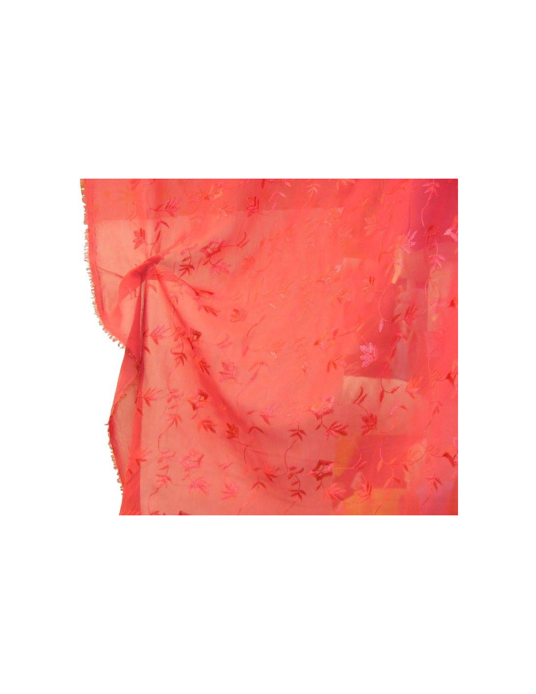 Gasa roja con ramilletes bordados en seda. Tiene una composición 100% poliester y un ancho de1,50m .Tejido muy ligero y vaporoso perfecto para fulares,pareos ,blusas ,trajes de fiesta...