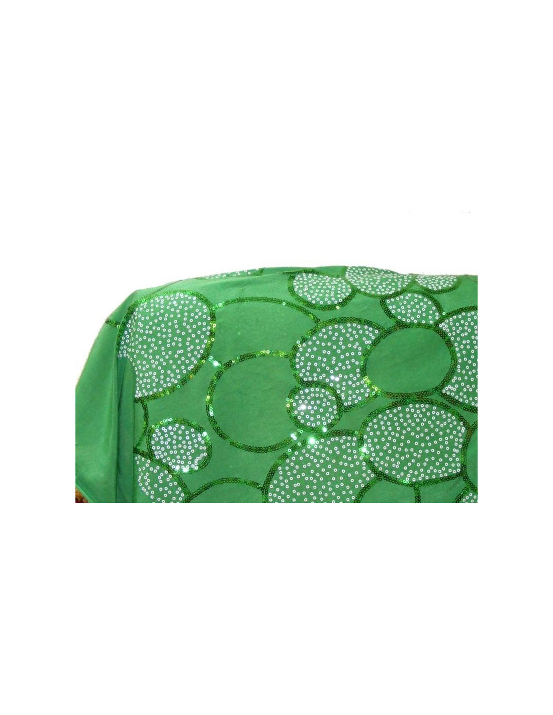 Tela de lucra verde con estampado de lentejuelas haciendo flores.Tela con cuerpo y elástica perfecta para prendas de espectacúlo,danza....