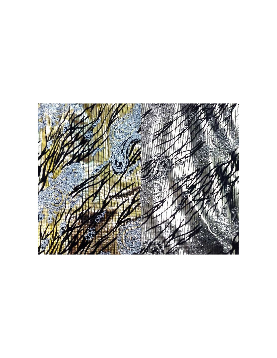 Tejido de punto negro con relieves metalizados y dibujos en glitter, compuesto el 95% en poliéster y el 5% en spandex, por lo que se trata de una tela ciertamente elástica. Ideal para la confección de vestidos para espectáculos de Carnaval. Disponible en base color oro o plata claro. Ancho 150 cm y composición: 95% poliéster y 5% spandex. Se vende por metros.