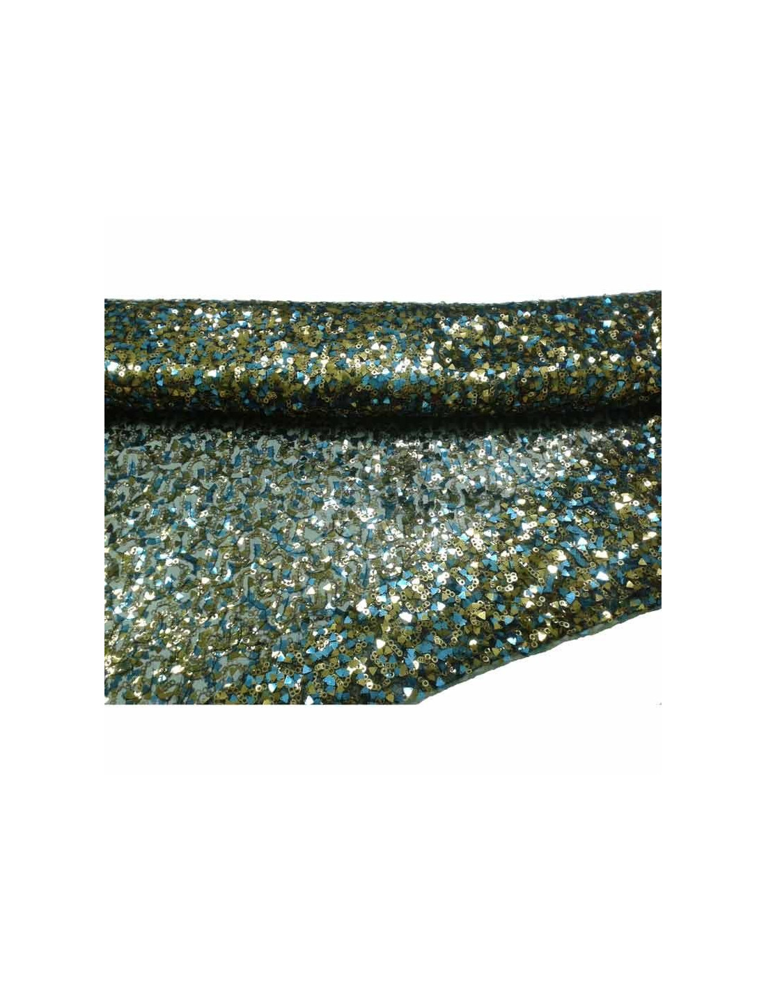 Tejido con lentejuela en forma triangular en oro y turquesa. Ancho 150cm