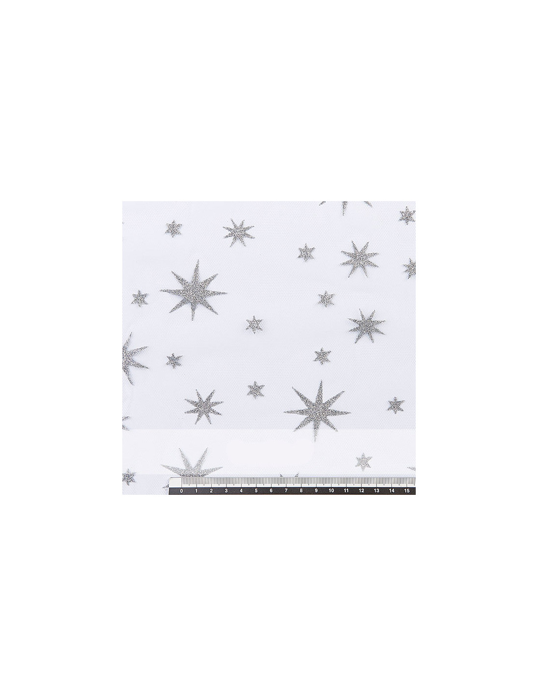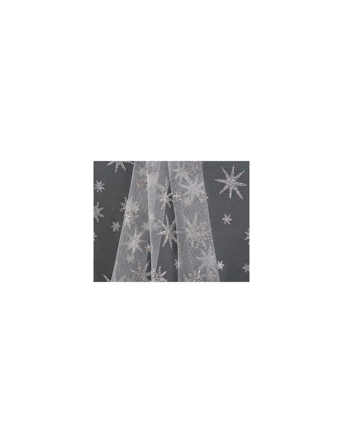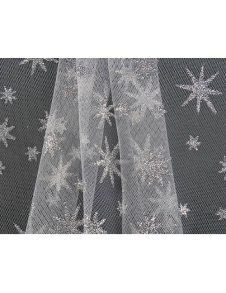 Tejido de Tul blanco con estrellas de purpurina plateadas . fabricado en 100% poliamida. La tela tiene una anchura de 150 cm y está disponible en varios colores.