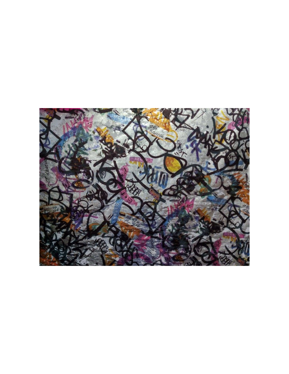 Tejido licra estampada con motivos de grafitis. Tiene una anchura de 1,50m. Se vende por metros.