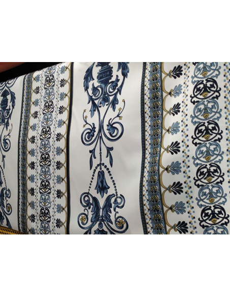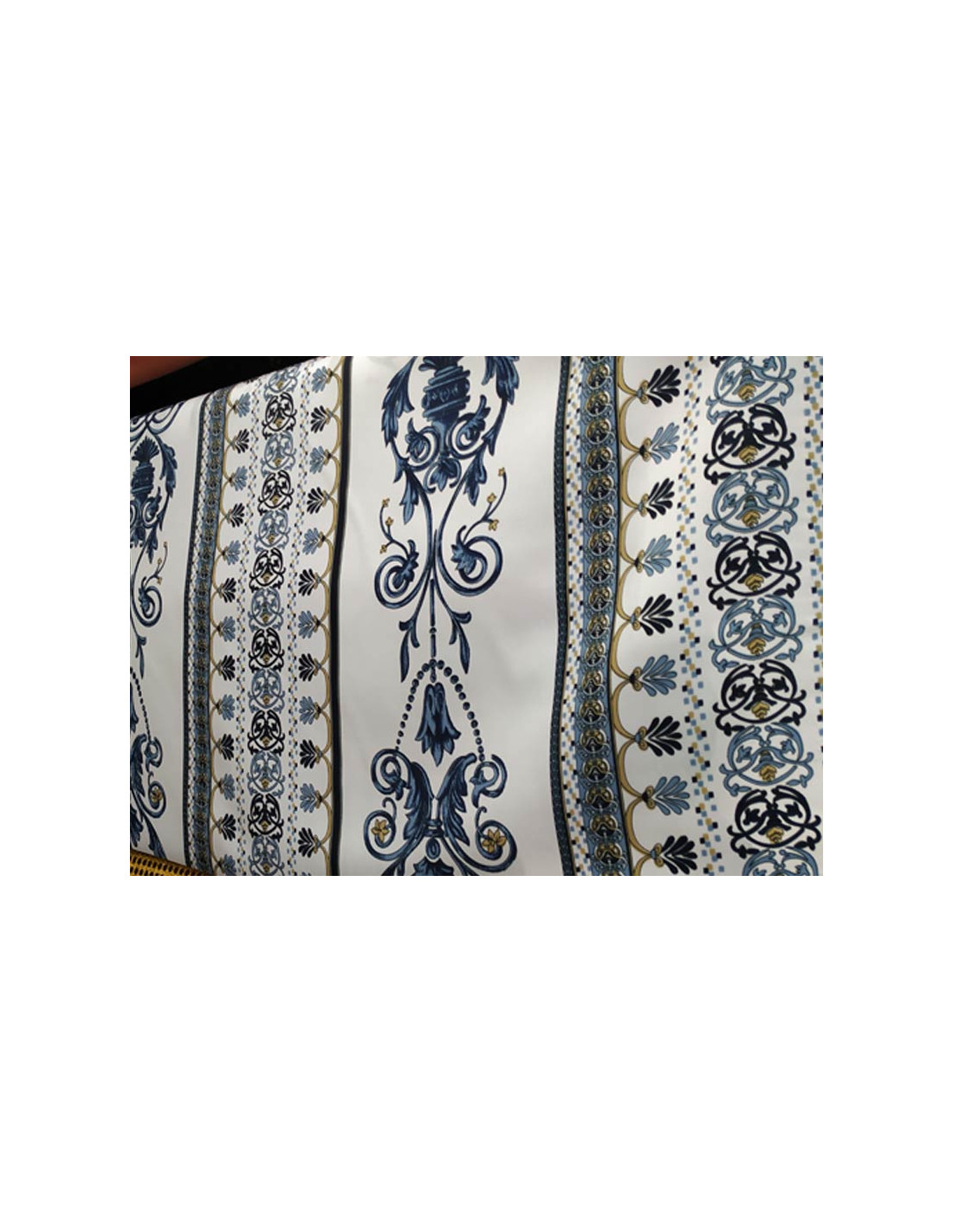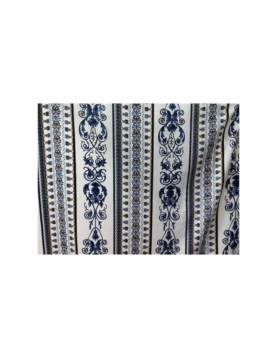 Tejido popelín fino estampado a modo de cenefa en tonos negros, azulones y toques dorados.