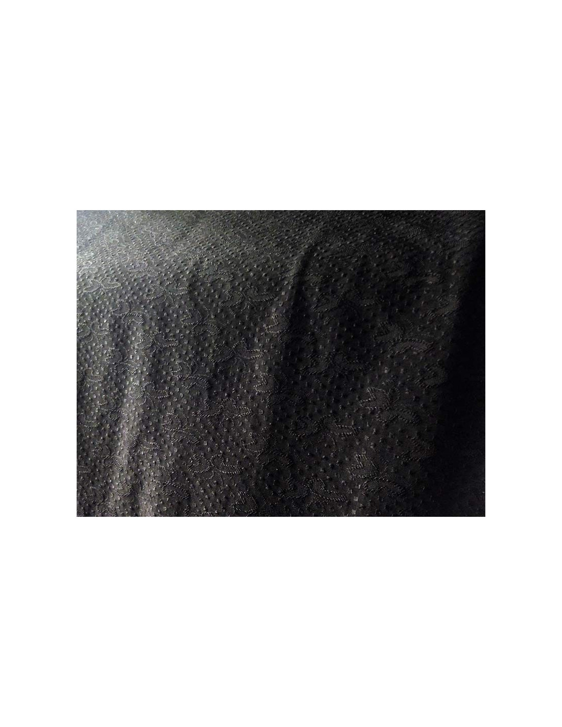Tejido de punto negro con mariposas y puntitos bordados al mismo tono,eástico,mate ,se adapta bien al cuerpo.