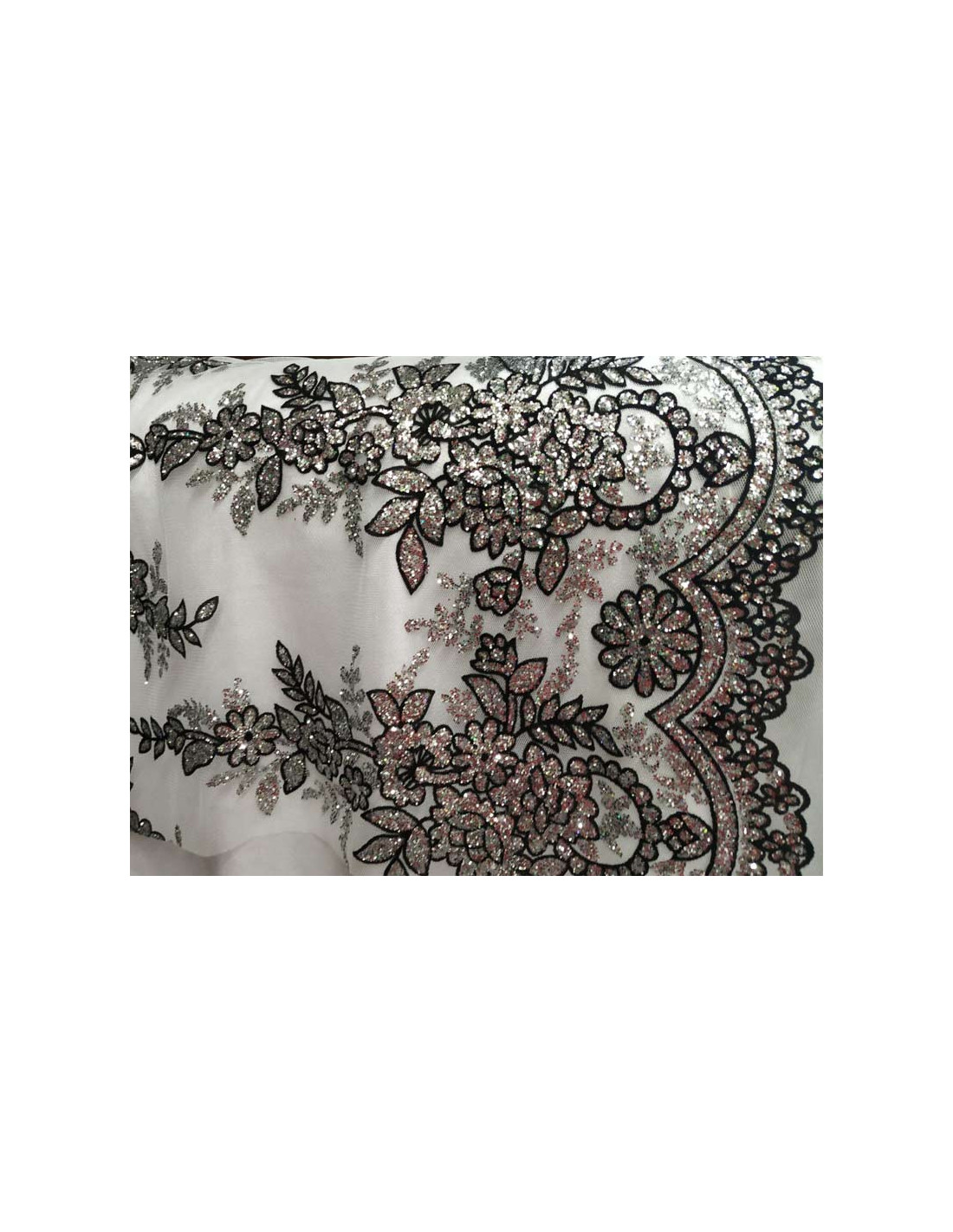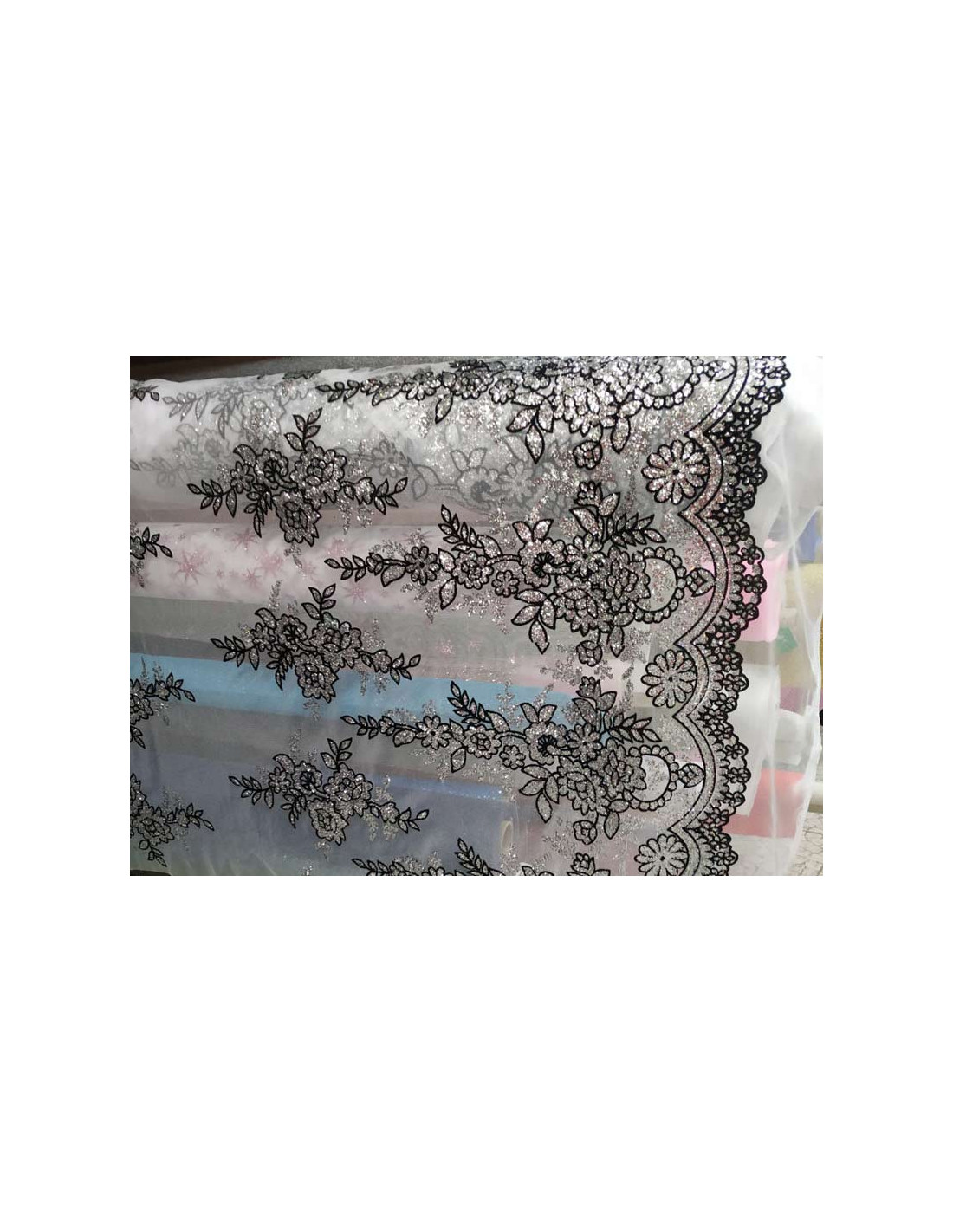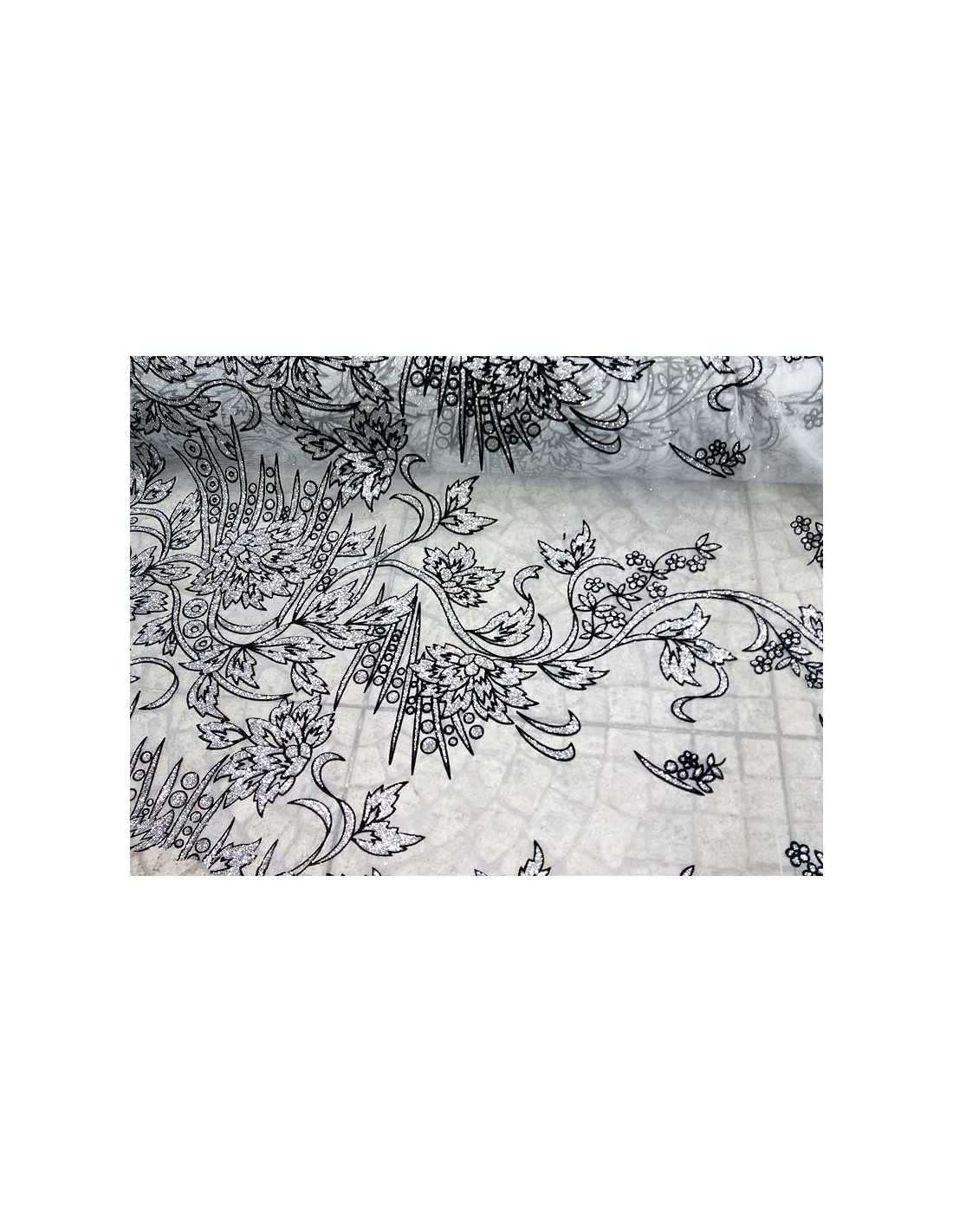 Tejido de Tul con base en color blanco transparente y decorado con flores en glitter plata con el borde negro. Fabricada en poliéster 100%, este tipo de tela resulta idónea para decoración interior, manualidades, disfraces...