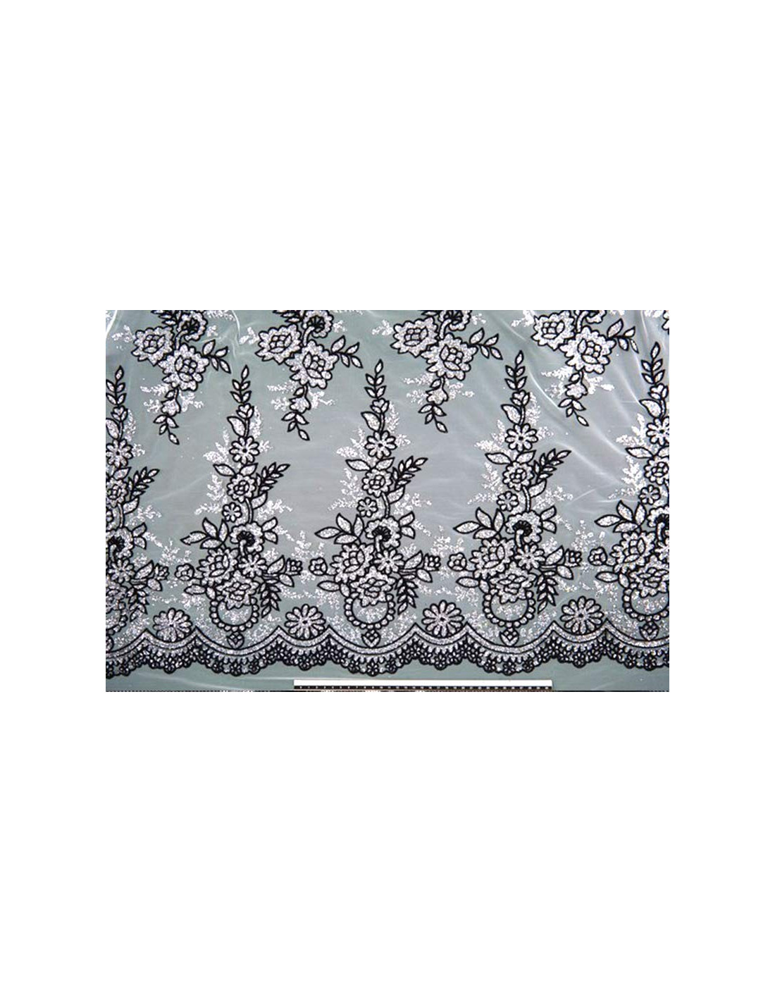 Tul Blanco con adorno de flores en purpurina  acabado con remate en ondas en un lado. Fabricado en 100% poliéster. La tela tiene una anchura de 140 cm.