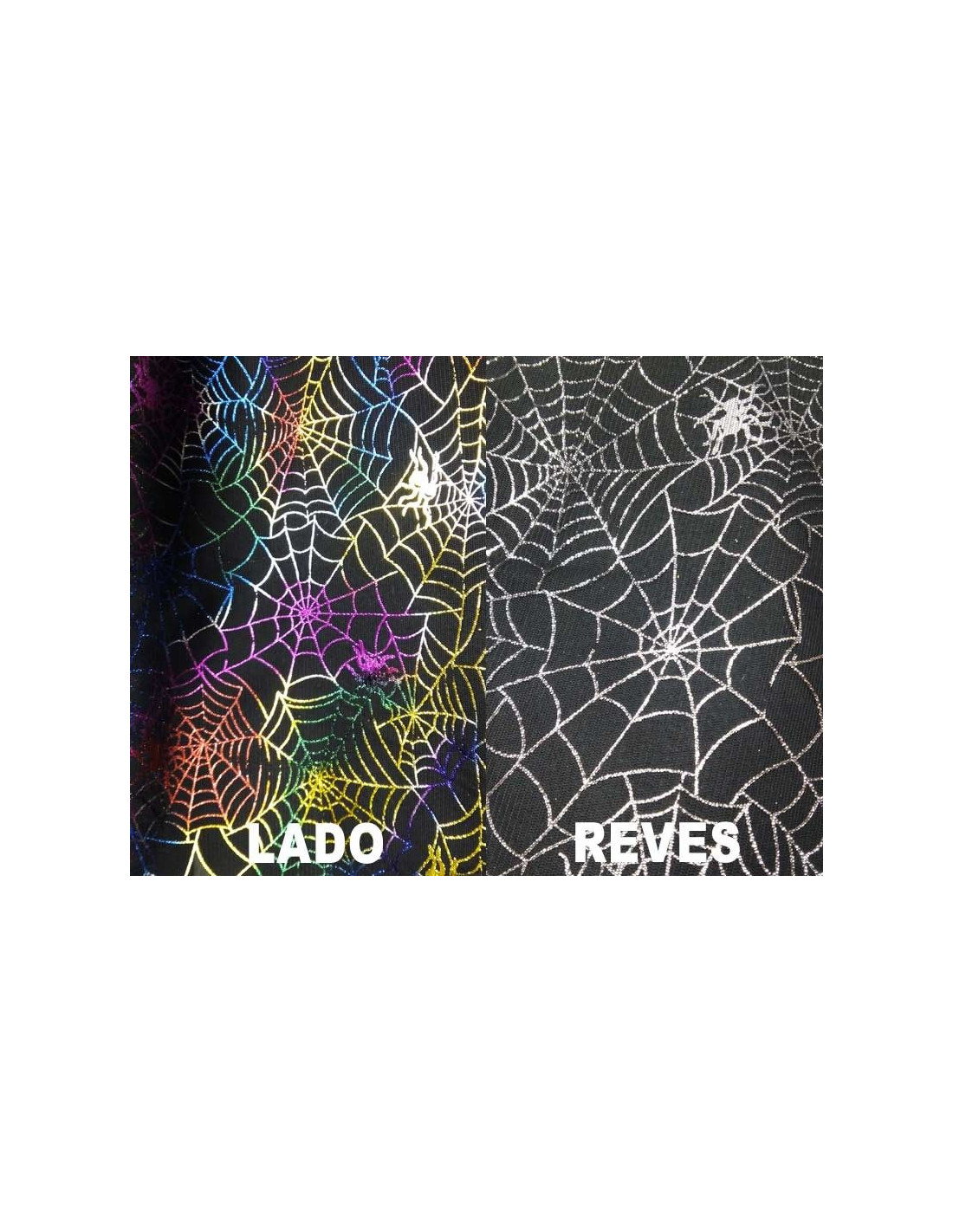 Tejido de tul negro de doble cara, estampado de telas de araña. Por un lado estampado multicolor y el revés en color plata. Precio por metro. Unidad mínima de compra 1m.