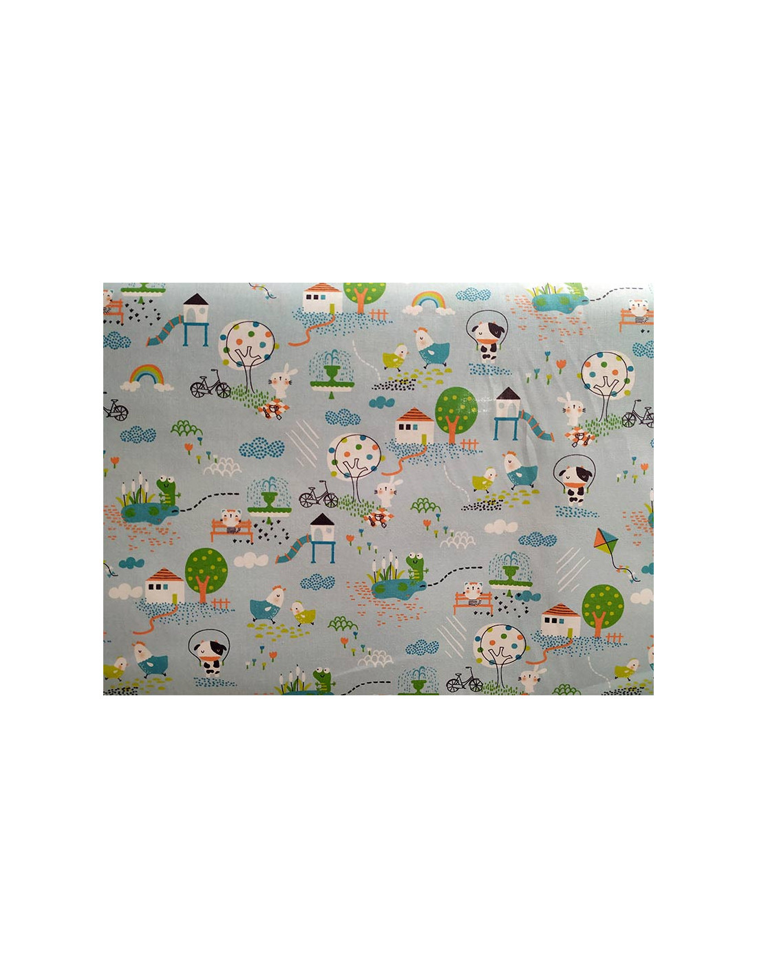 Tela animales de granja estampada con motivos infantiles de animalitos de granja como vacas, gallinas... y elementos decorativos como arco iris, árboles, bicicletas. Ideal para ropa o decoración infantil, mascarillas, bolsas, cojines, etc.