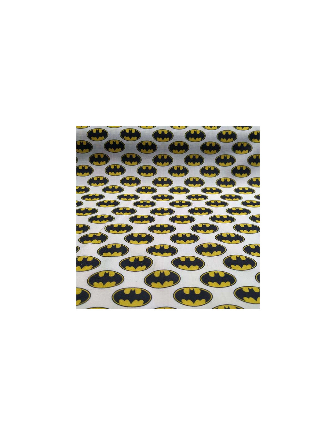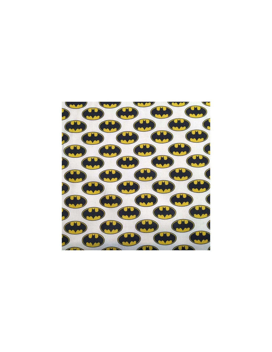 Tela Batman logo que encantará a niños y mayores. Este popelín con fondo blanco tiene el logotipo de Batman estampado. Sorprende a los pequeños con cojines, riñoneras o monederos confeccionados con esta preciosa tela. Perfecta para la confección de mascarillas.