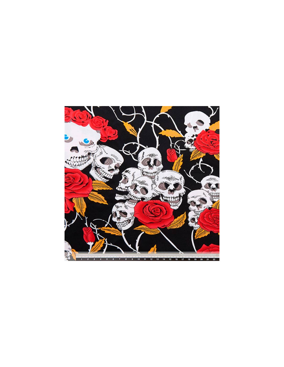 Tela calaveras Lorca con una composición 98% algodón y 2% espándex que mide 150cm de ancho.