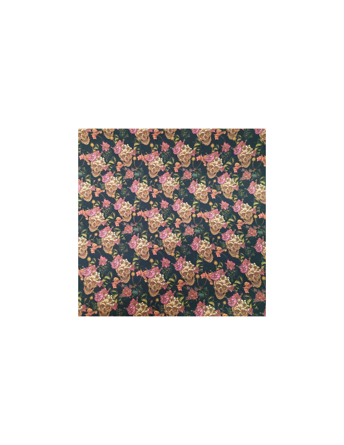 Tela calaveras y floral rosa con un fondo negro y estampada con calaveras y flores. Es una tela oscura pero las calaveras y las flores rosas le dan un roque llamativo de color. Es ideal para confeccionar mascarillas, accesorios de tela o disfraces.