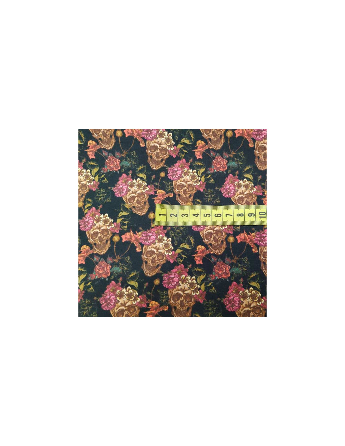 Tela calaveras y floral rosa con una composición 100% algodón y que mide 150cm de ancho.