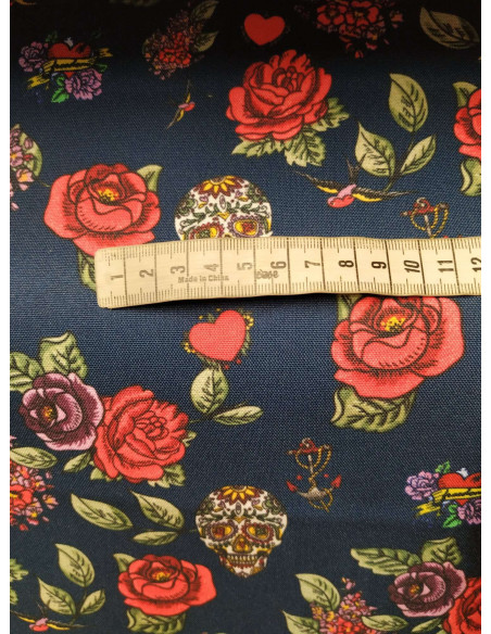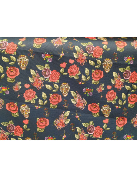 Tela calaveras y rosas vintage con una composición 100% poliéster y una anchura de 150cm de ancho