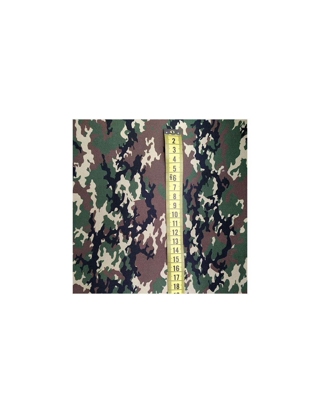 Tela camuflaje caqui que se vende por metros, con una composición 100% poliéster y que mide 140cm de ancho.