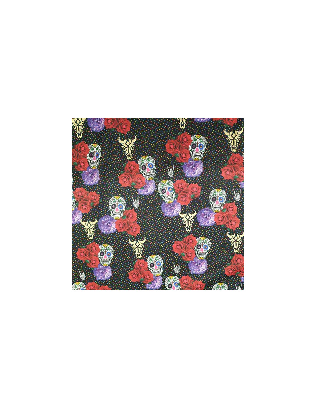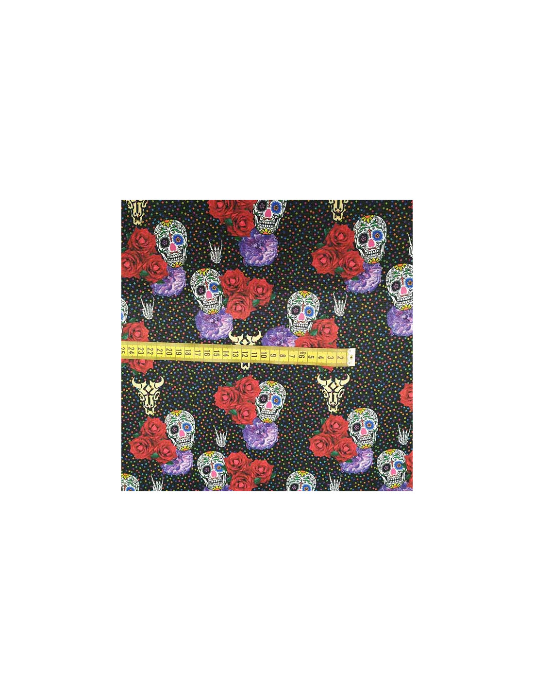 Tela Catrinas con rosas rock con una composición 100% poliéster y que mide 150cm de ancho.