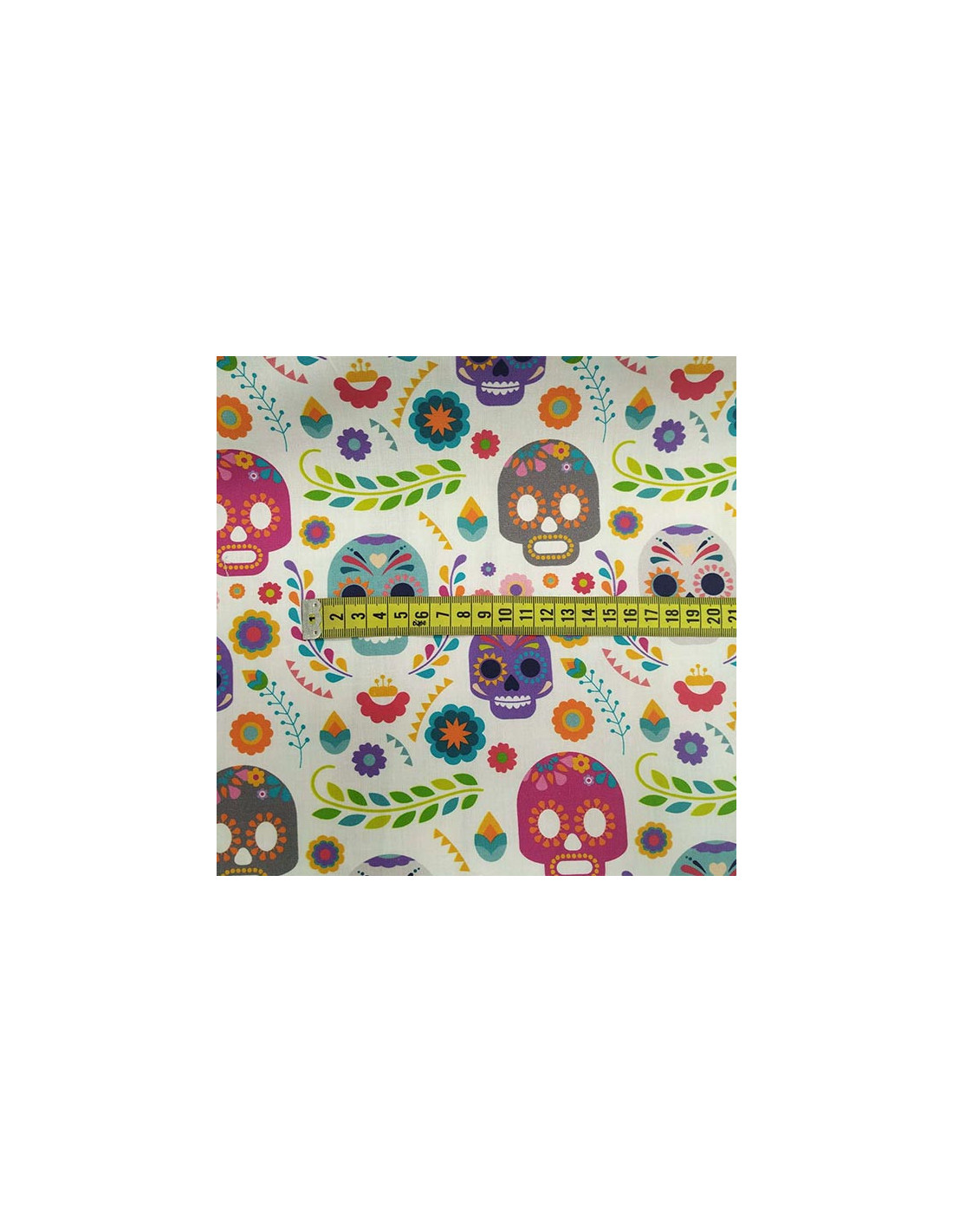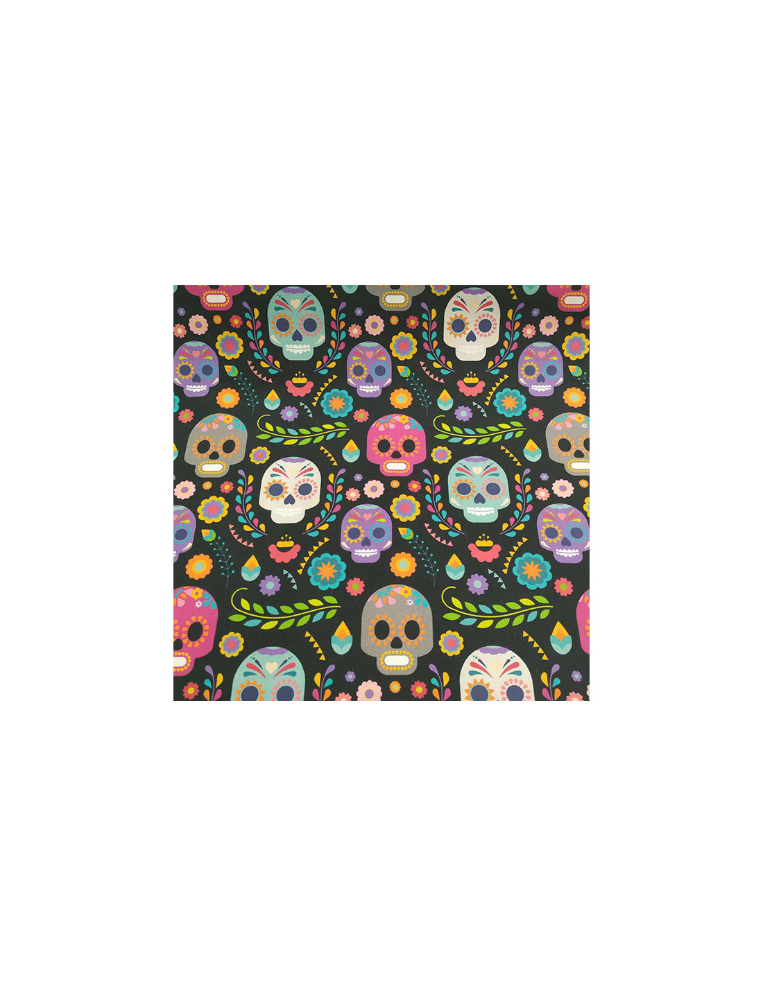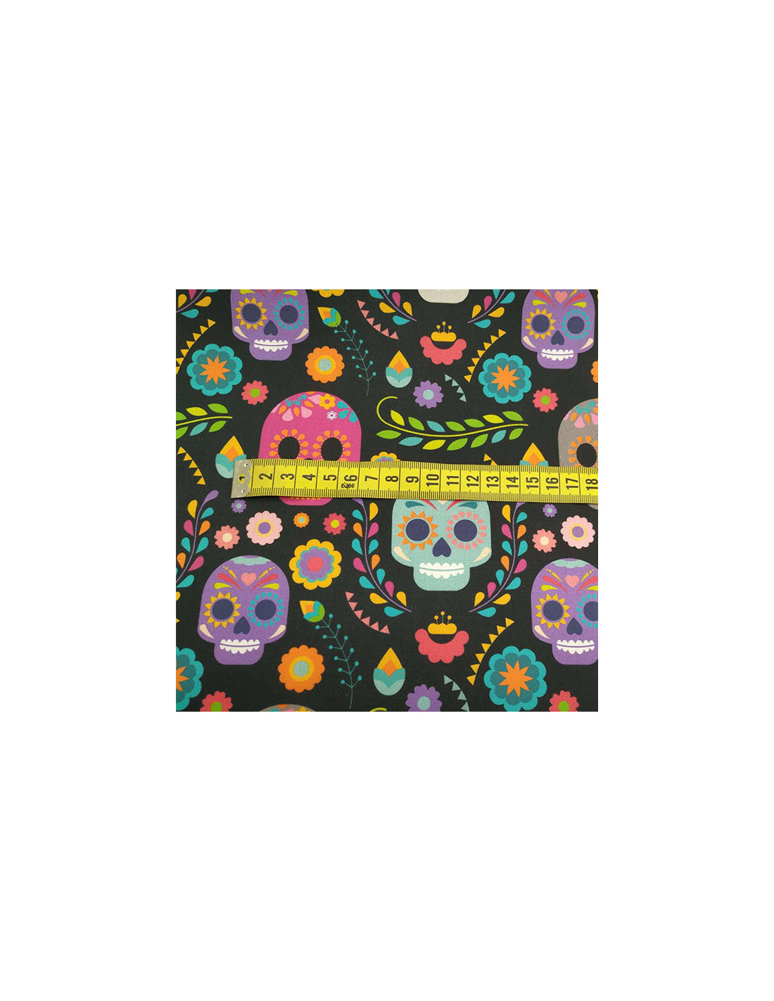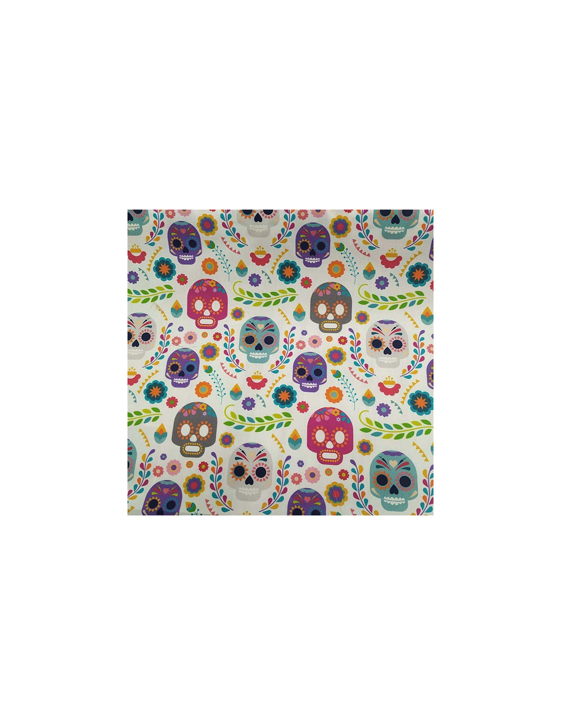 Tela de 100% algodón estampada con calaveras mejicanas con alegre colorido ,muy ligera perfecta para mascarillas,bolsas , manualidades. Tiene un ancho de 150cm