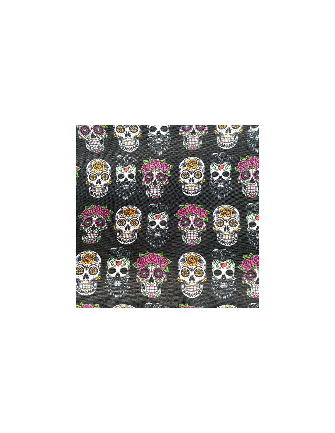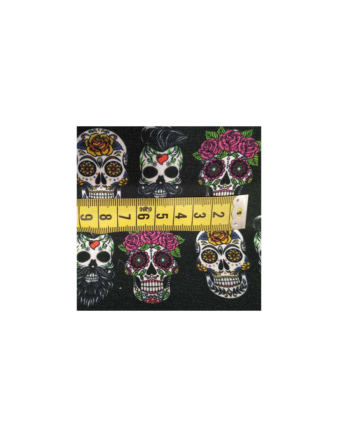 Tela Catrinas surtidas de color negro con distintos modelos calaveras mexicanas estampadas, ideal para la confección de mascarillas. Cada calavera tiene un tamaño aproximado de 4,4cm de alto y 3,5cm de ancho.