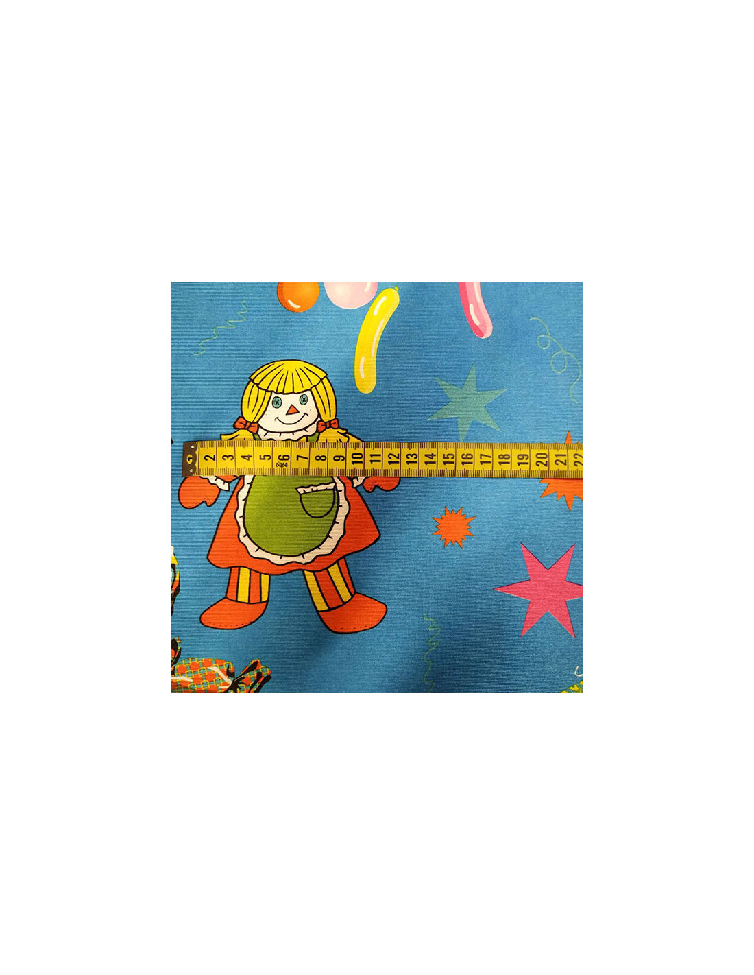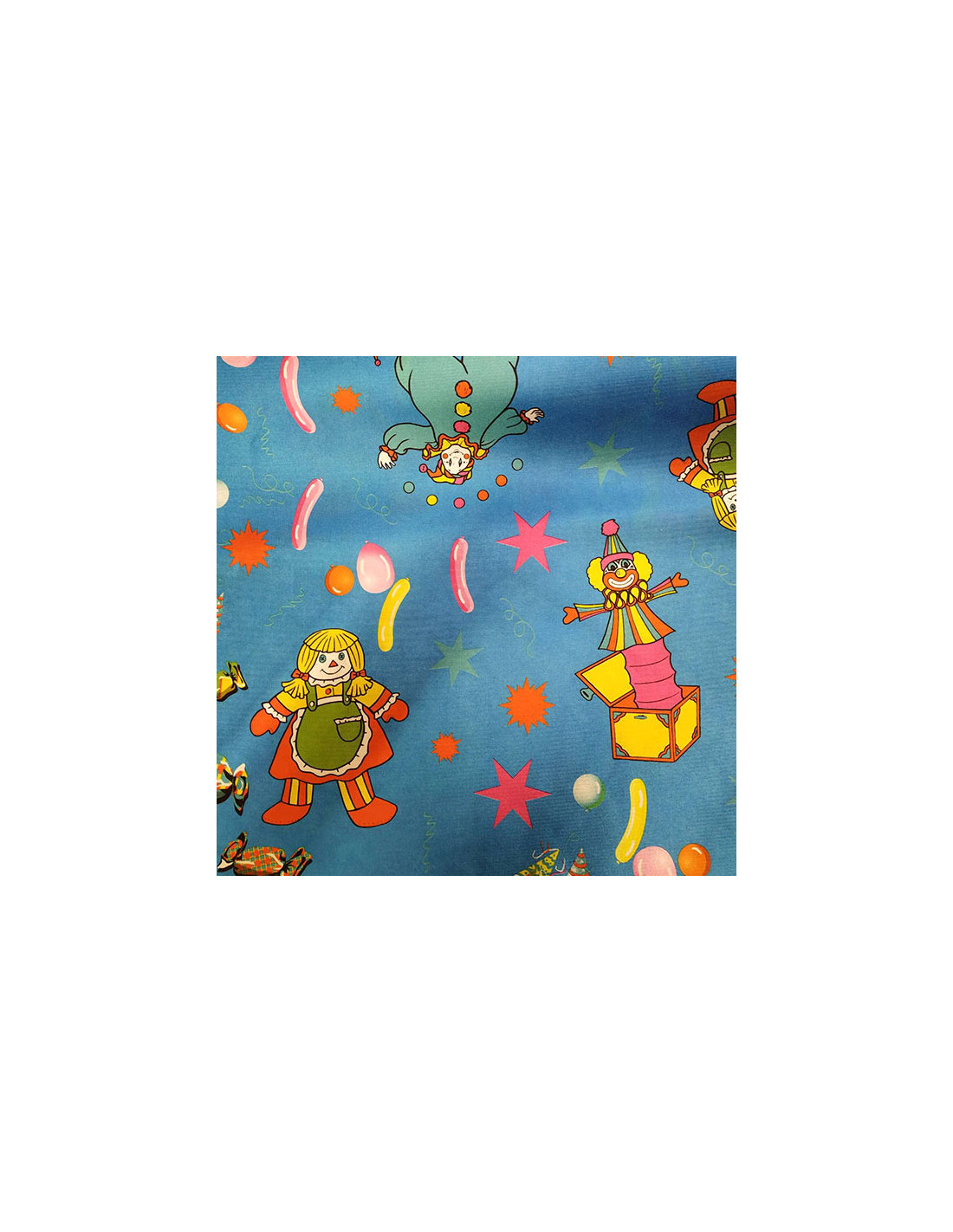 Tela circo infantil de rasete con un fondo azul con dulces y globos sobre el que se estampan payasos y muñequitas. Ideal para la confección de mascarillas, cojines, bolsos, etc. Y para confeccionar disfraces o prendas para Carnaval.
