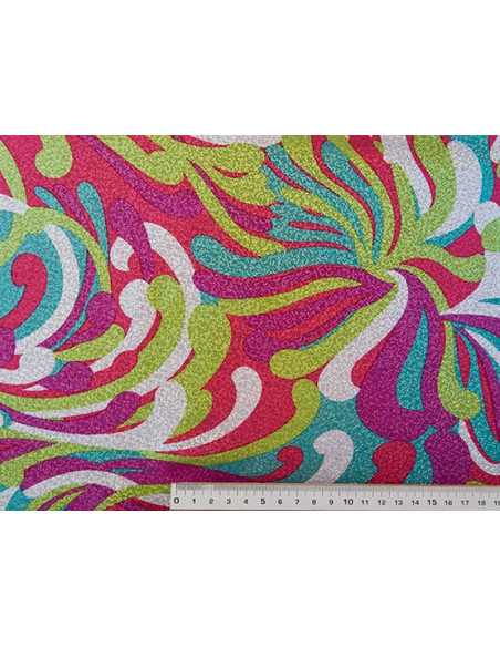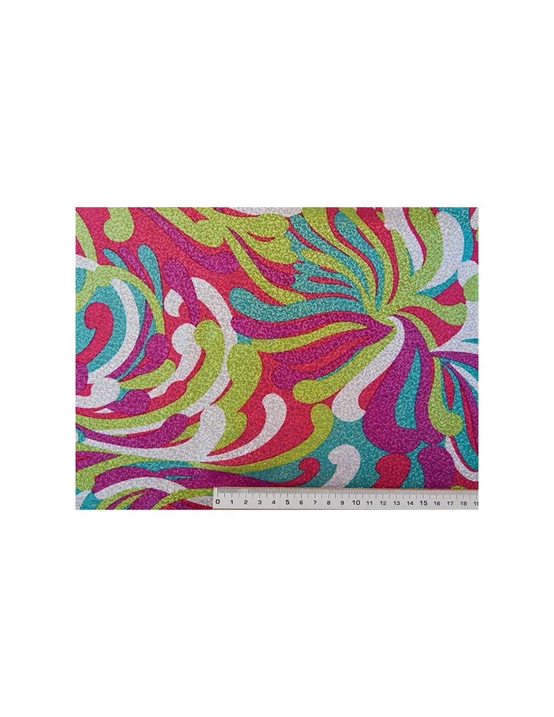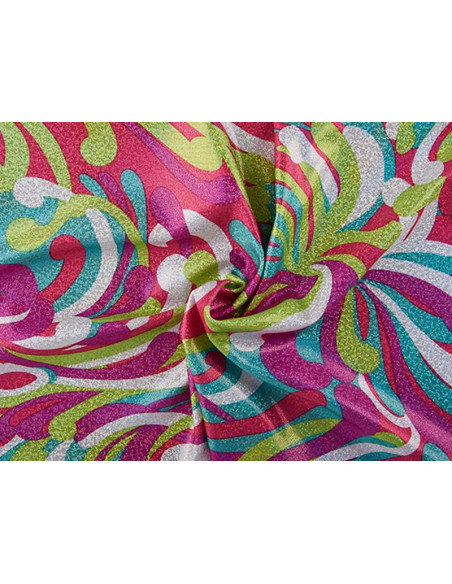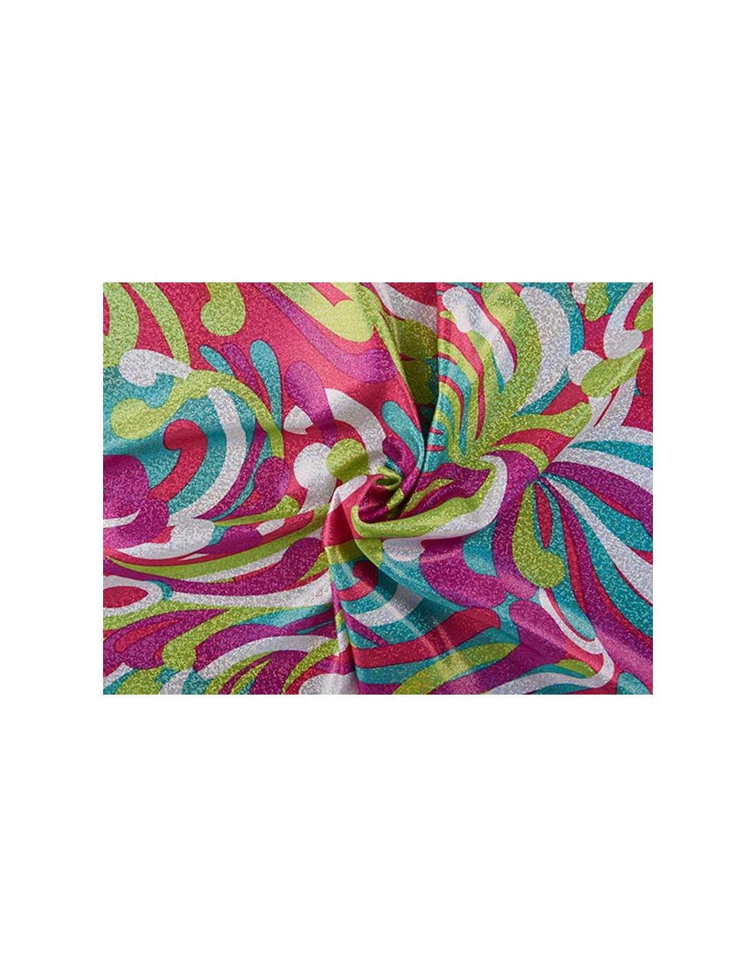 Tela de lycra estampada.Tela con mucho colorido y brillo ideal para prendas ajustadas para danza,espectáculos disfraces...