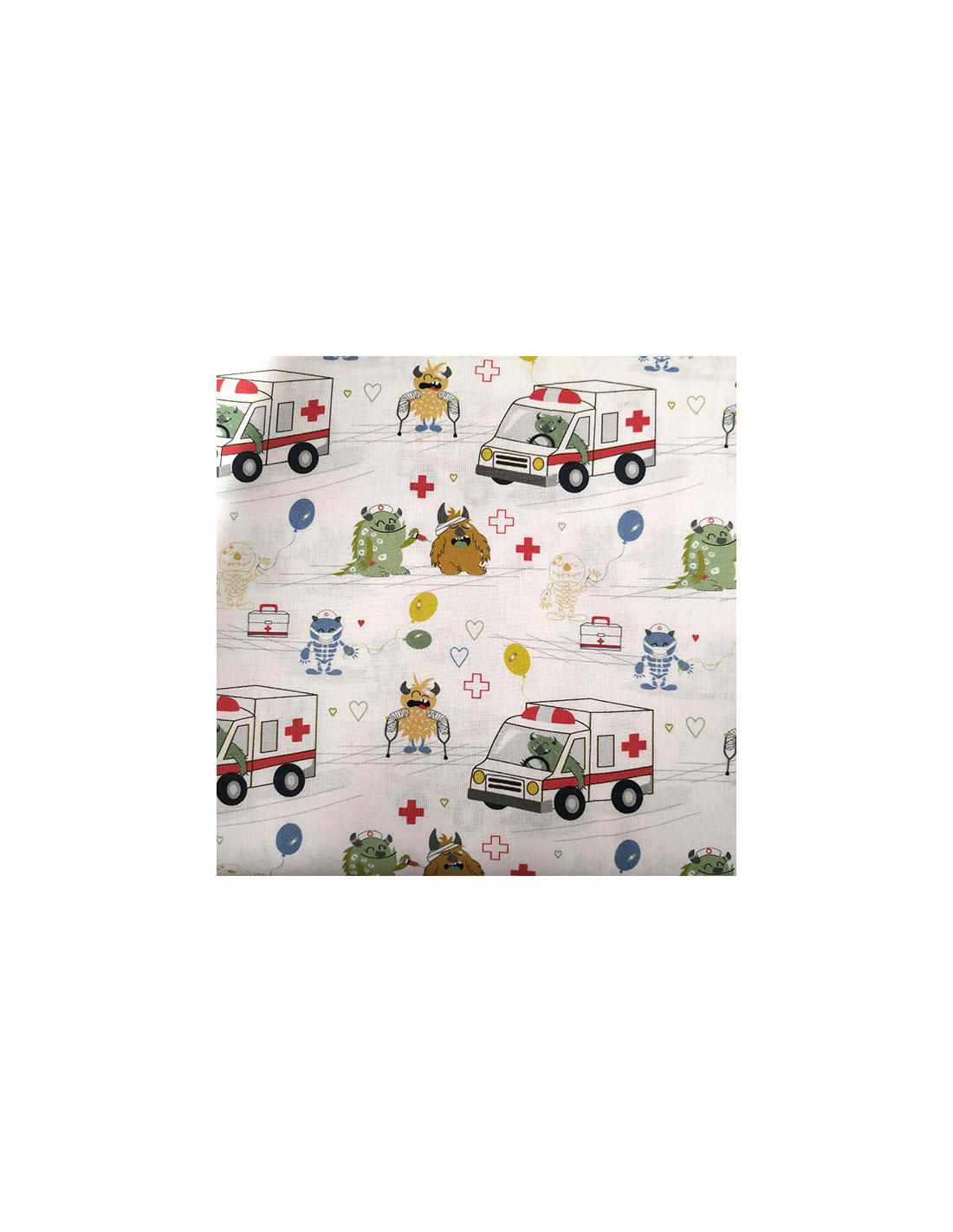 Tela de algodón ambulancias con un divertido estampado de ambulancias y monstruitos como médicos, enfermeros y pacientes. Ideal para confeccionar productos infantiles como mascarillas, bolsas, etc.