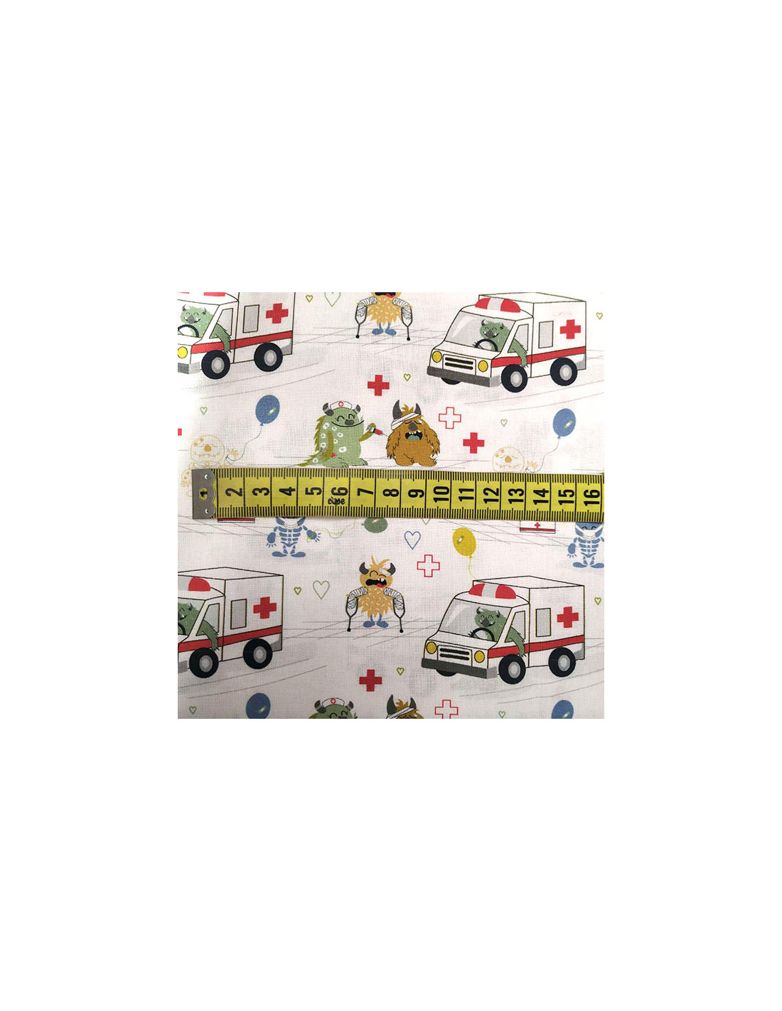 Tela de algodón ambulancias 100% algodón estampada con monstruitos, ambulancias y un ancho de 150cm.