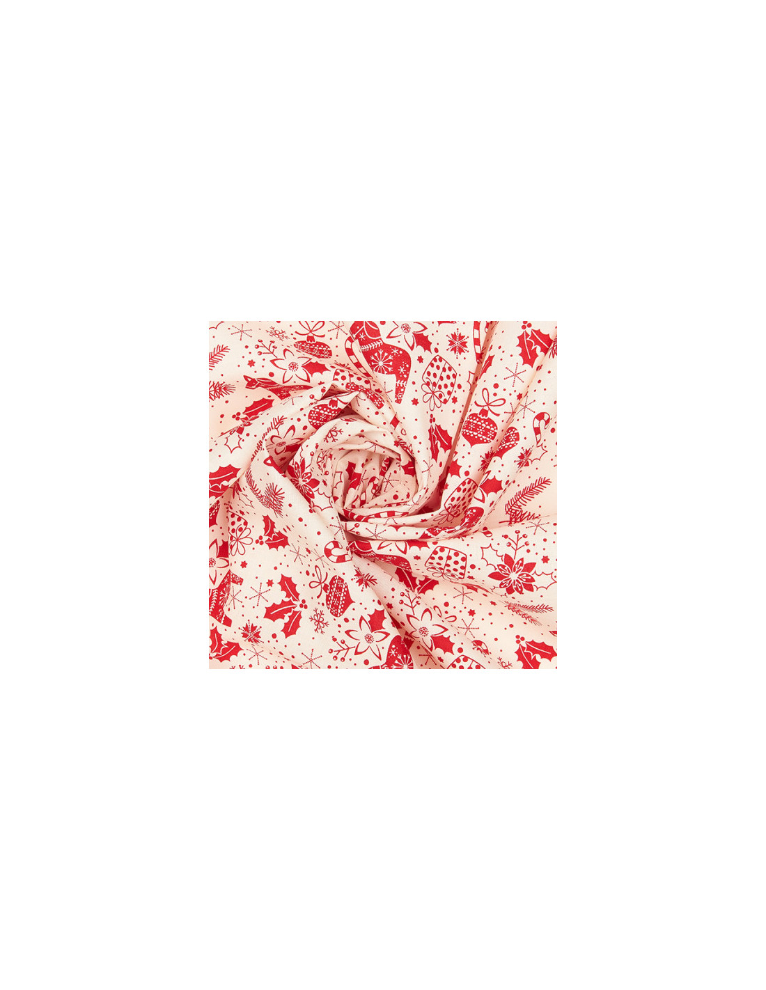 Tela de algodón navideña con fondo blanco y estampada con adornos de navidad en color rojo. Ideal para tus accesorios y decoraciones de Navidad.