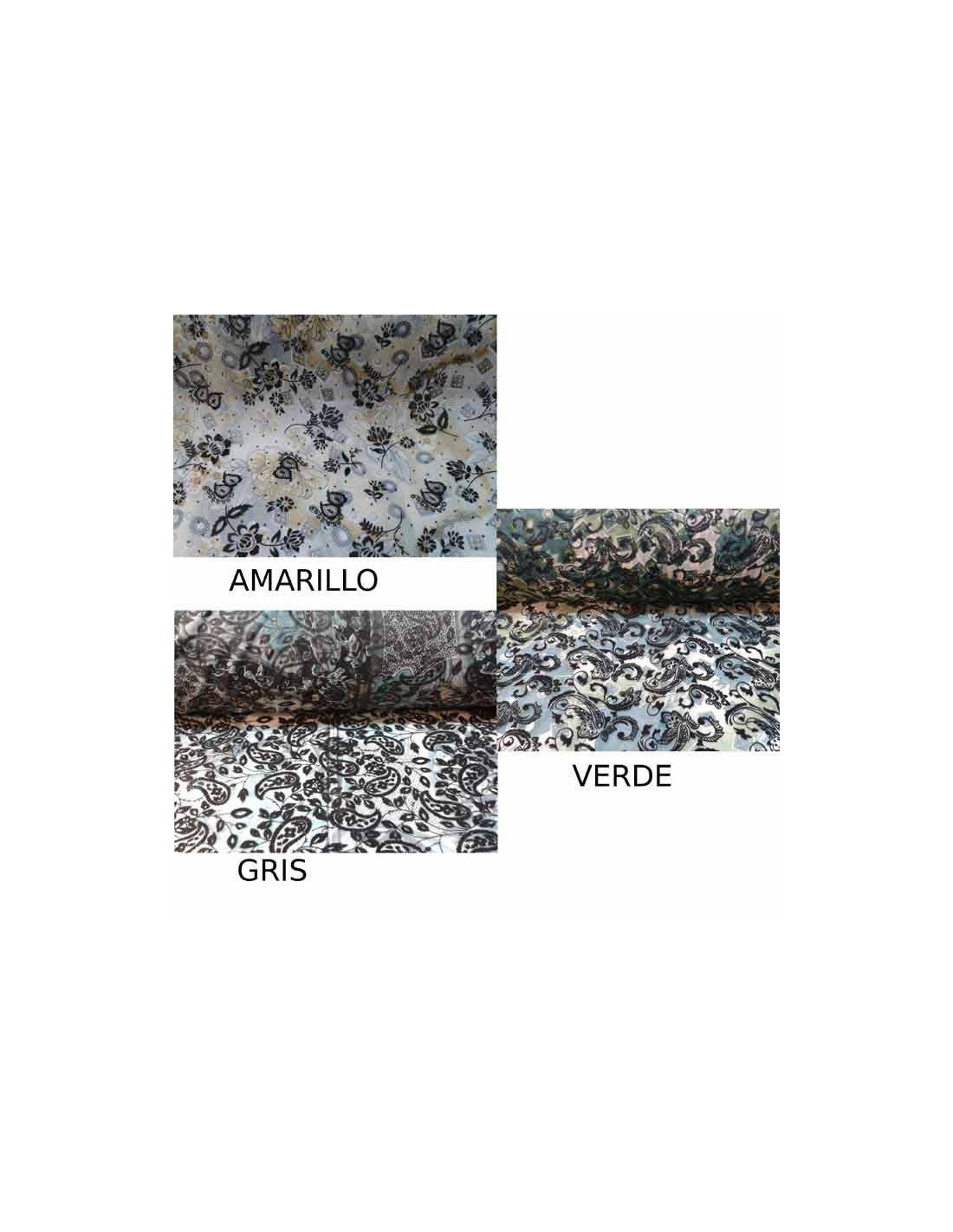 Gasa flocada en negro con un relieve aterciopelado de motivos florales.Tejido muy elegante perfecto para fulares,pareos ,blusas ,trajes de fiesta...