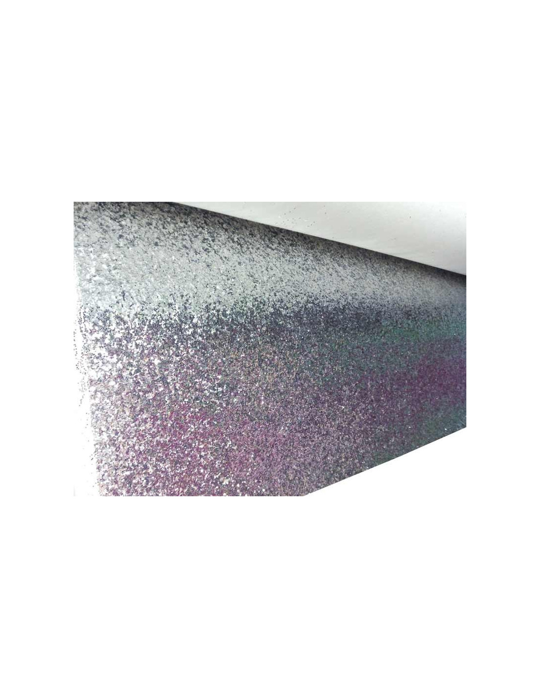 Tejido de polipiel recubierta por glitter o purpurina en color plateado. Fabricada en poliéster 100%, se trata de un tipo de tela que destaca por su suavidad al tacto, opacidad, con peso y que es acolchada. Ideal para decoración exterior y tapizado de sofás. Ancho de la pieza 140 cm. Se vende por metros.