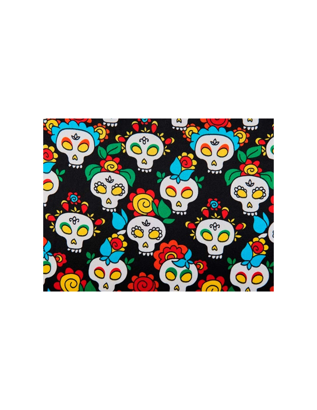 Tela de Raso con calaveras mexicanas estampadas ideal para disfraces de Halloween. Con un fondo negro liso, presenta un colorido estampado de catrinas mexicanas multicolores. Dimensiones de 150cm de ancho. Se vende por metros (cada unidad corresponde a 1 metro).