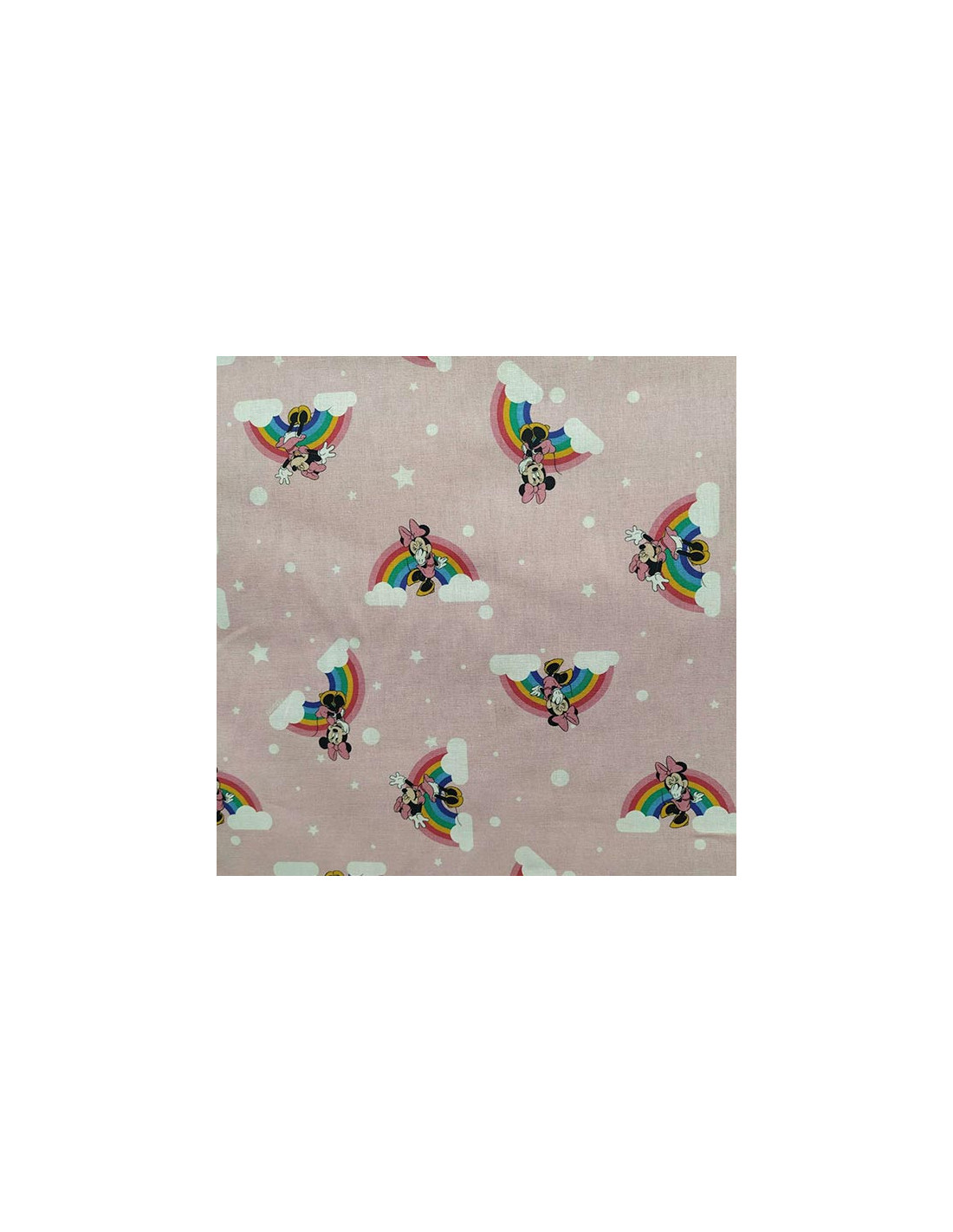 Tela Minnie arco iris con un fondo rosita claro y estampada con la figura de Minnie en distintas postes y gestos, y un arco iris de fondo.