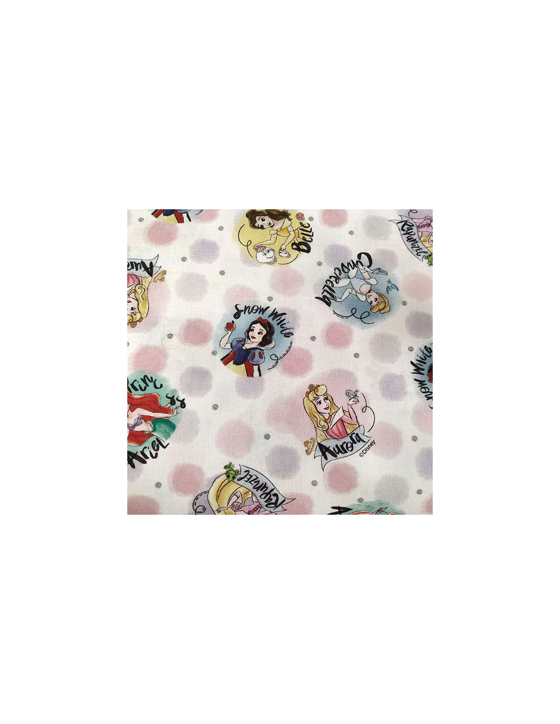 Tela princesas Disney que gustará tanto a niños como mayores. Esta tela con un fondo blanco y tonalidades rosas y moradas tiene la imagen de algunas de las princesas Disney más conocidas. Ideal para la confección de mascarillas, gorritos o cualquier otro tipo de accesorio como cojines, monederos, cortinas, bolsos, etc. Esta original tela también puede servirte para confeccionar prendas de ropa como camisetas