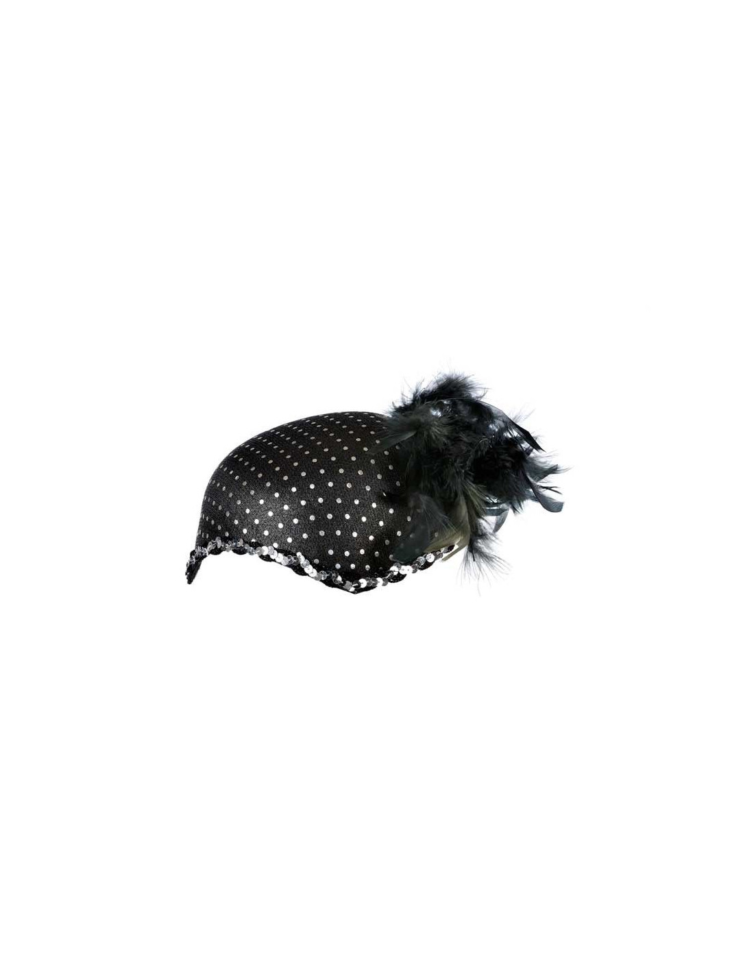 Gorro de fieltro decorado exteriormente con tela con motivos brillantes, viveado y con plumas