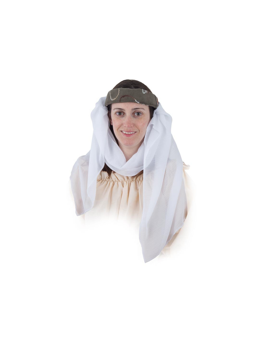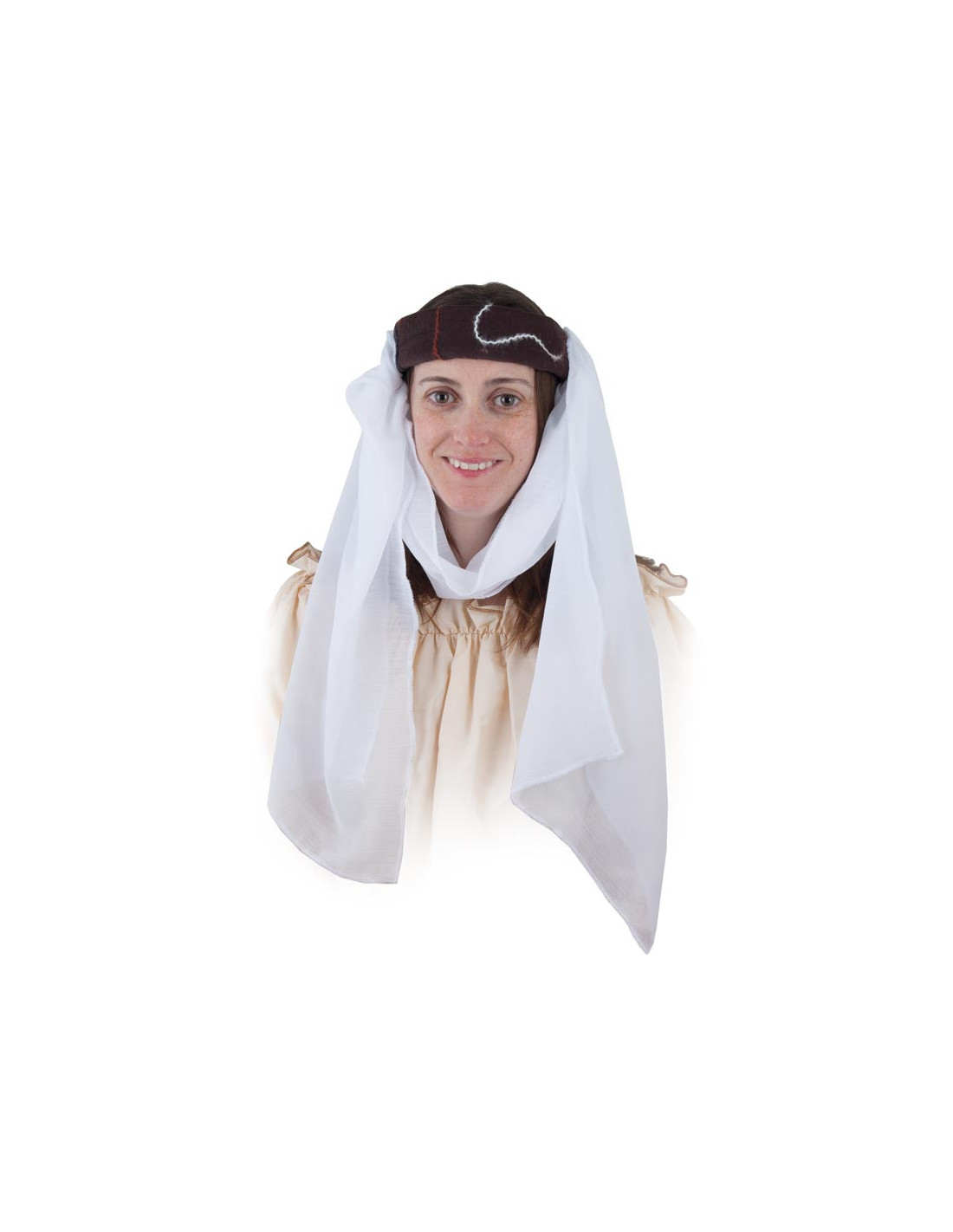 Tocado medieval en color marrón con velo blanco. Fabricado en micropana bordada con refuerzo de guata en su interior y el velo de tela de gasa. Disponible en color marrón y verde.
