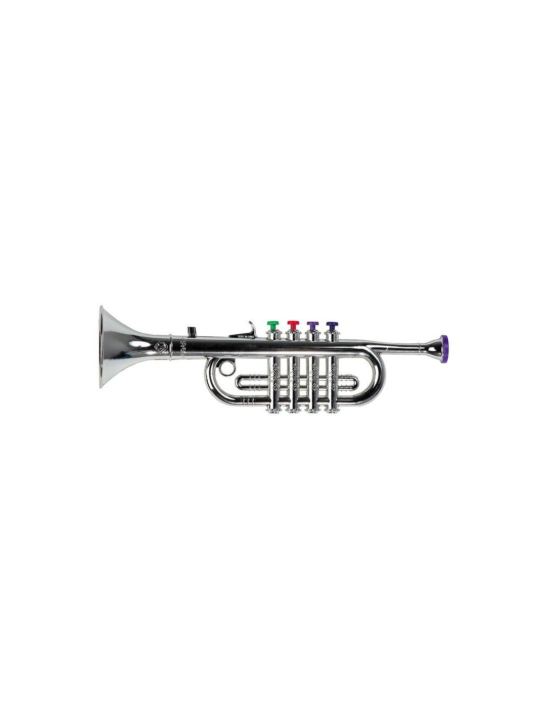Trompeta de plástico de 38cm de largo con botones de colores, para combinar con tu traje de clown y ser el más gracioso. Se vende en colores surtidos: oro y plata.