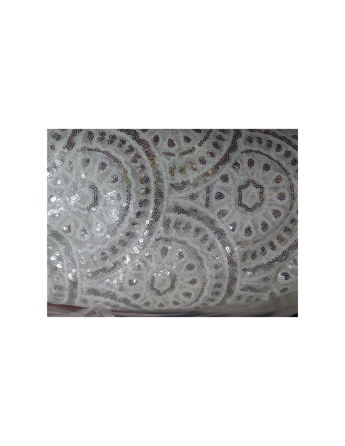 Tejido con base de tul decorado con lentejuelas blancas y plata de diferentes tonalidades, cosidas de forma ordenada y simétrica formando círculos. Fabricado en poliéster 100%, se trata de un tipo de tela que destaca por su adaptabilidad y ligereza a la hora de llevarlo. Ideal para la confección de vestidos de fiesta o disfraces de Nochevieja. Ancho pieza 150 cm. Se vende por metro. Unidad mínima de compra 1m.