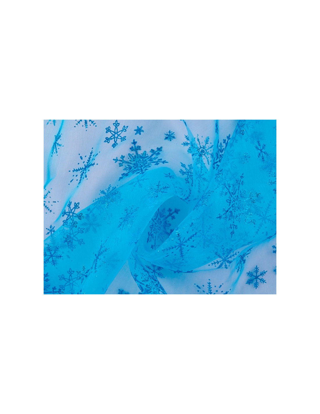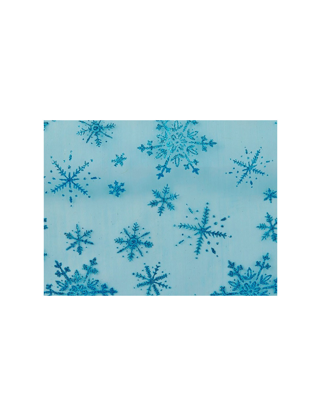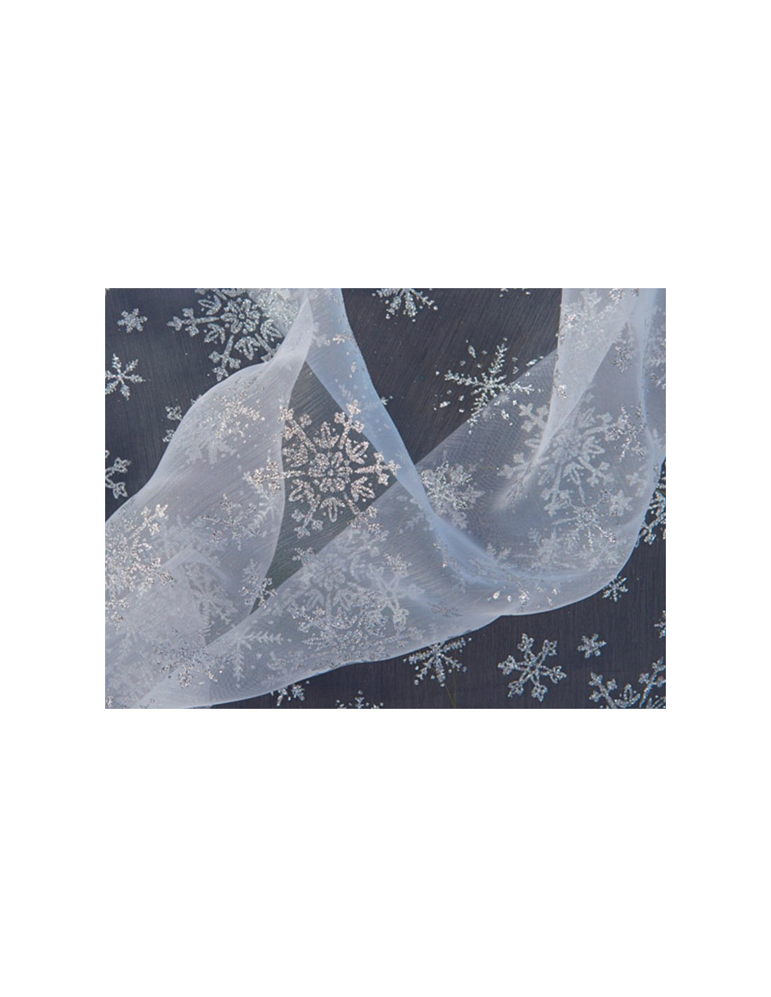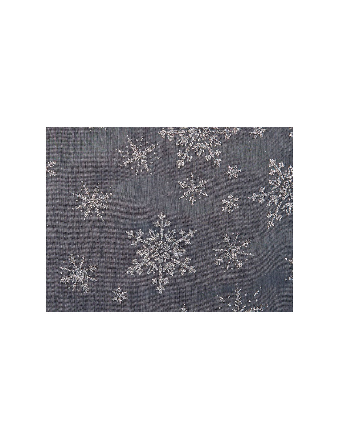 Tejido de organza con copos de nieve en purpurina .Fabricado 100% en poliester con anchura de 150 cm.