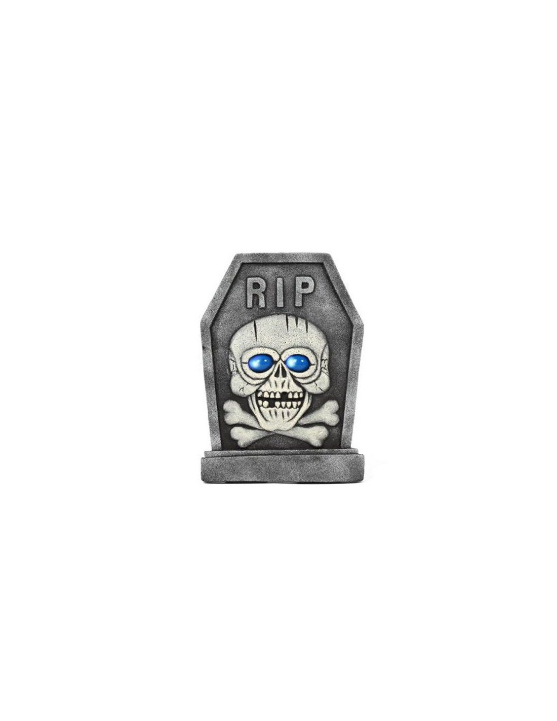 Ambienta tu fiesta de Halloween con esta tumba con calavera en ojos azules. las medidas son 58x42x4cm