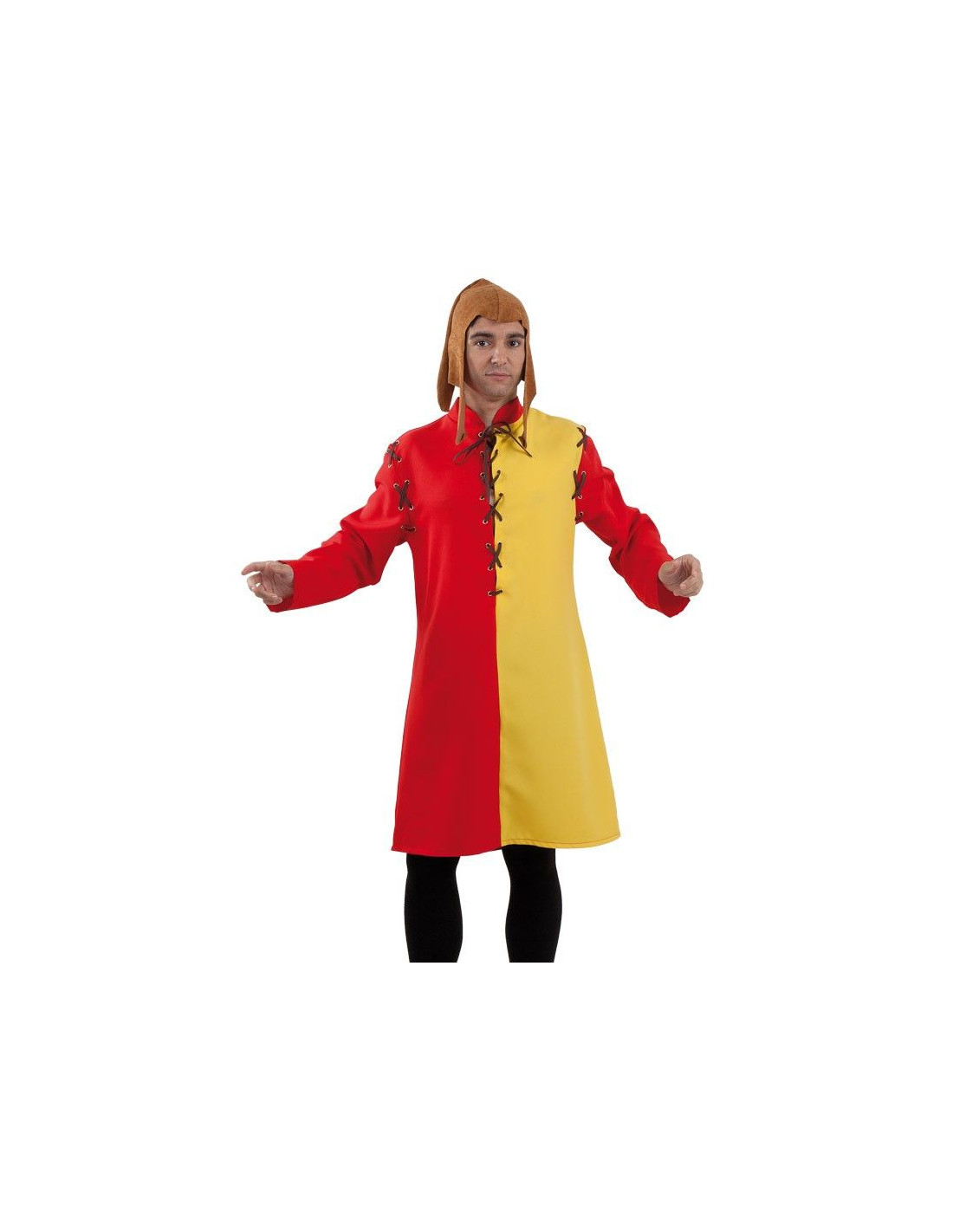 Túnica medieval de adulto que puede utilizarse como sobrevesta. Fabricada en poliéster 100%, la mitad de color rojo y mitad amarilla, con cordones y ojetes para ajustar en la parte delantera. Disponible en varias tallas.