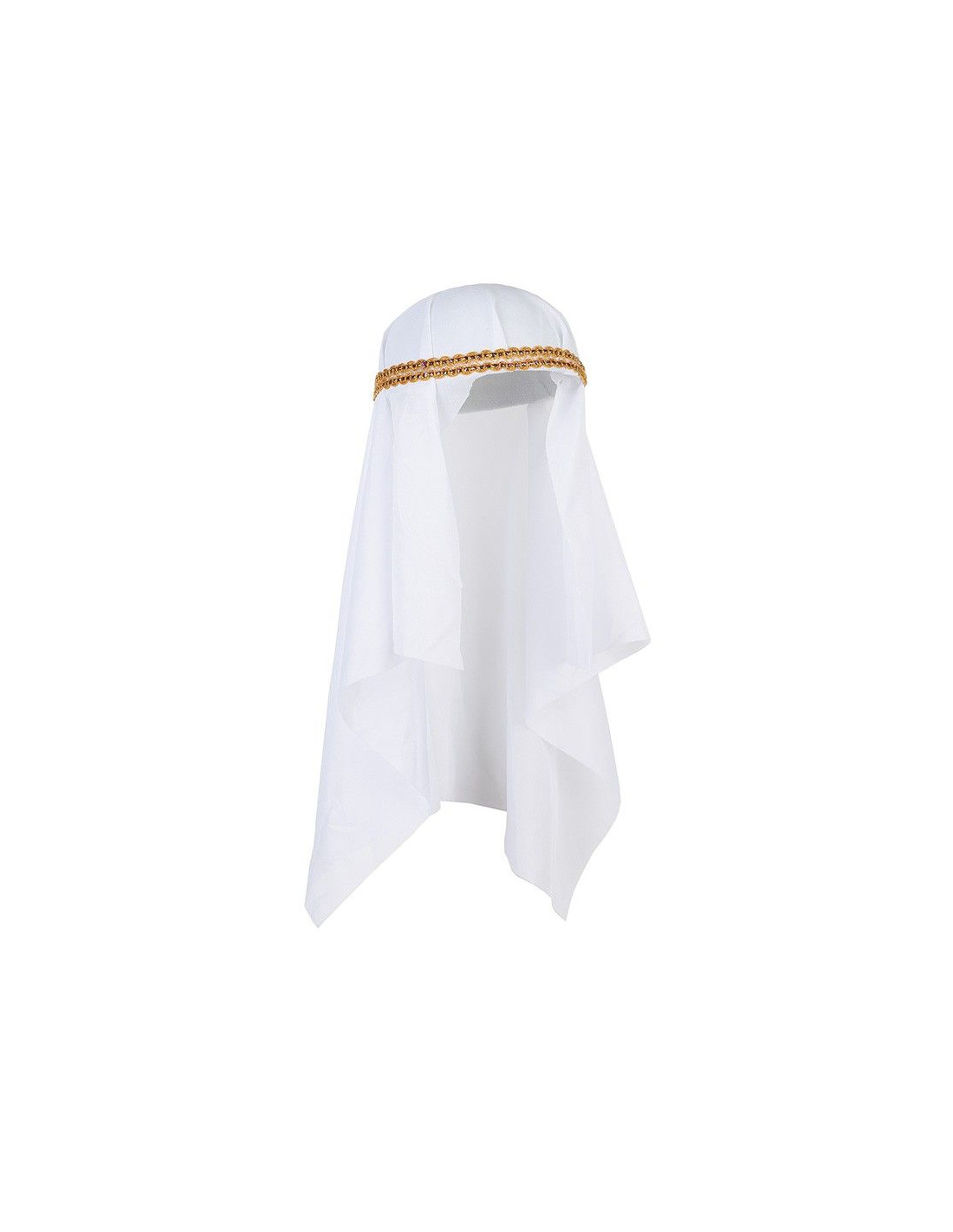 Turbante árabe blanco de 58cm. de perímetro. Tiene una base de casquete de fielto, cubierto por un tejido blanco que cae sobre los hombros. Disfrázate de árabe o de paje para la cabalgata de Reyes.