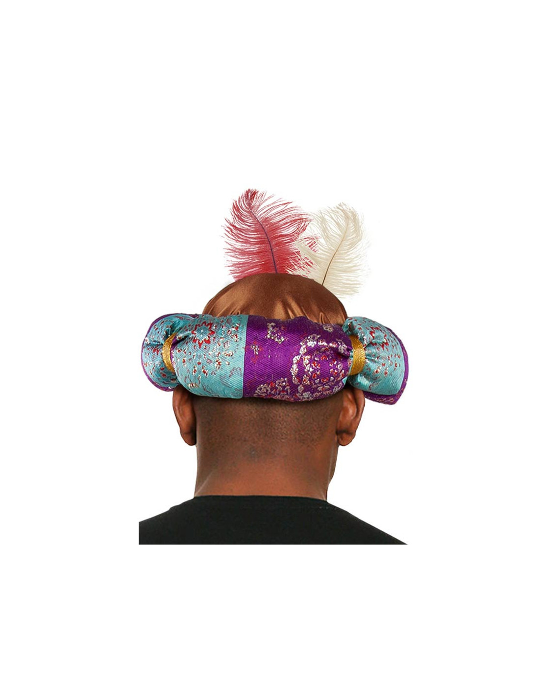 Turbante árabe con plumas en tonos morado, azul y dorado.