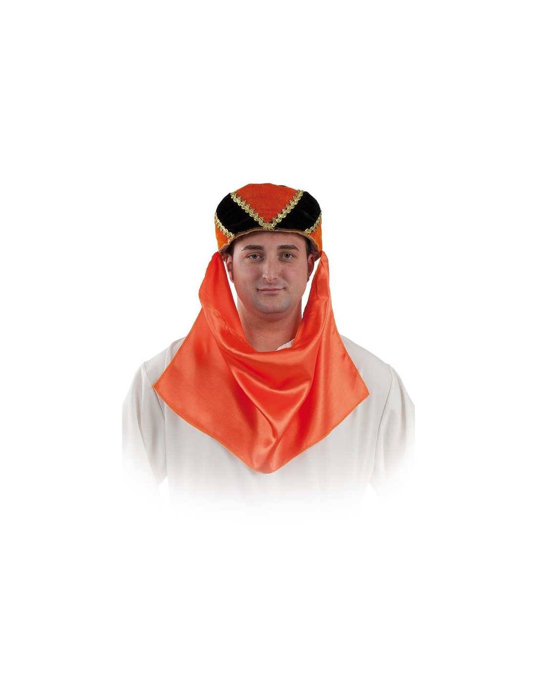 Disfruta de las fiestas de moros y cristianos complementando tu disfraz de árabe con esye turbante musulmán.Disponible en color naranja. Incluye motivos decorativos en color negro con bordes dorados y velo en la parte delantera. Ideal para tu difraz de paje o Rey Mago Baltasar